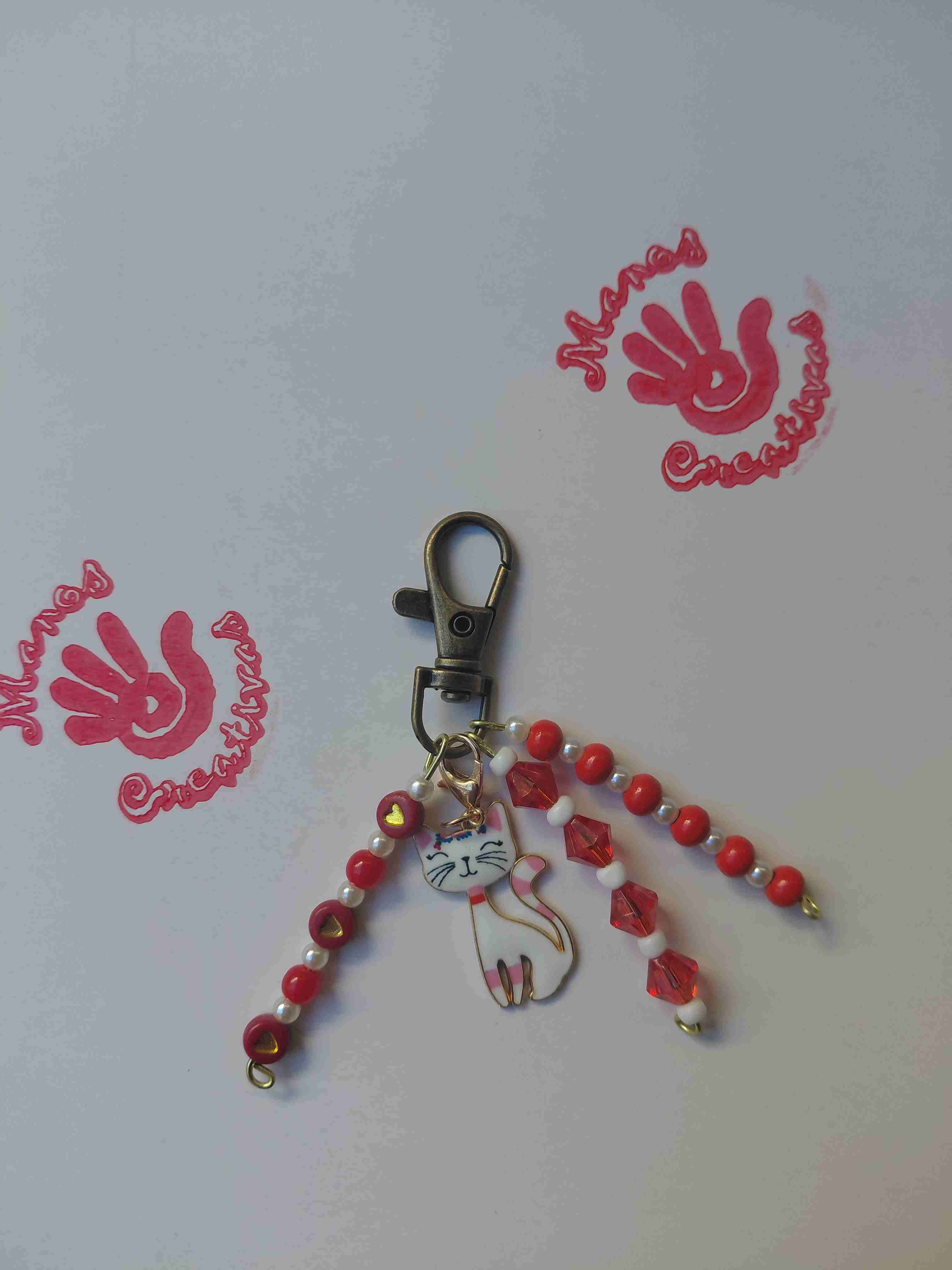 Llavero artesanal con figura de gato y cuentas rojas. Ideal para personalizar tus llaves. Nuevo y único.