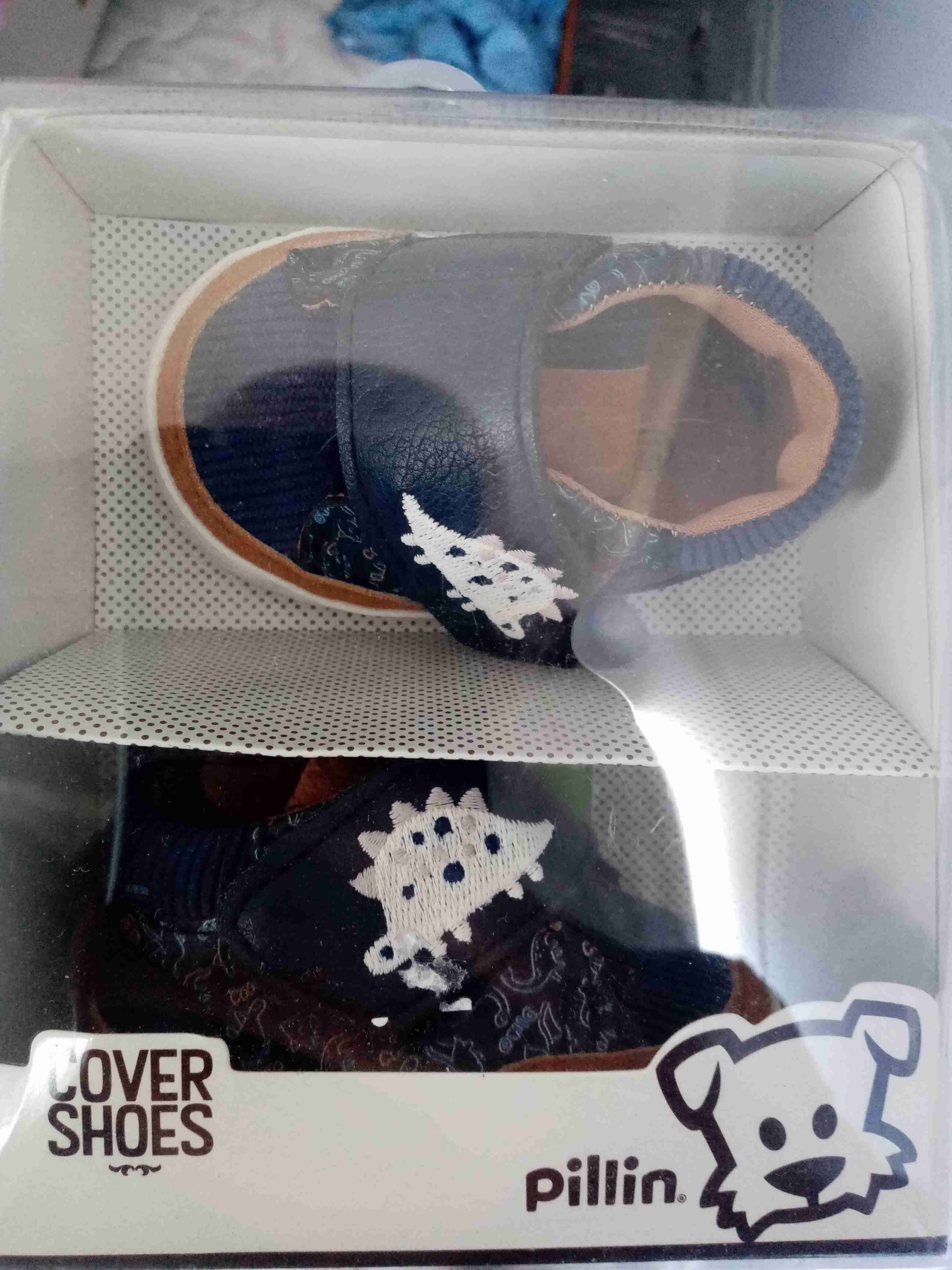 Zapatos para bebé de color azul con diseño de dinosaurio. En su caja original, estado nuevo.