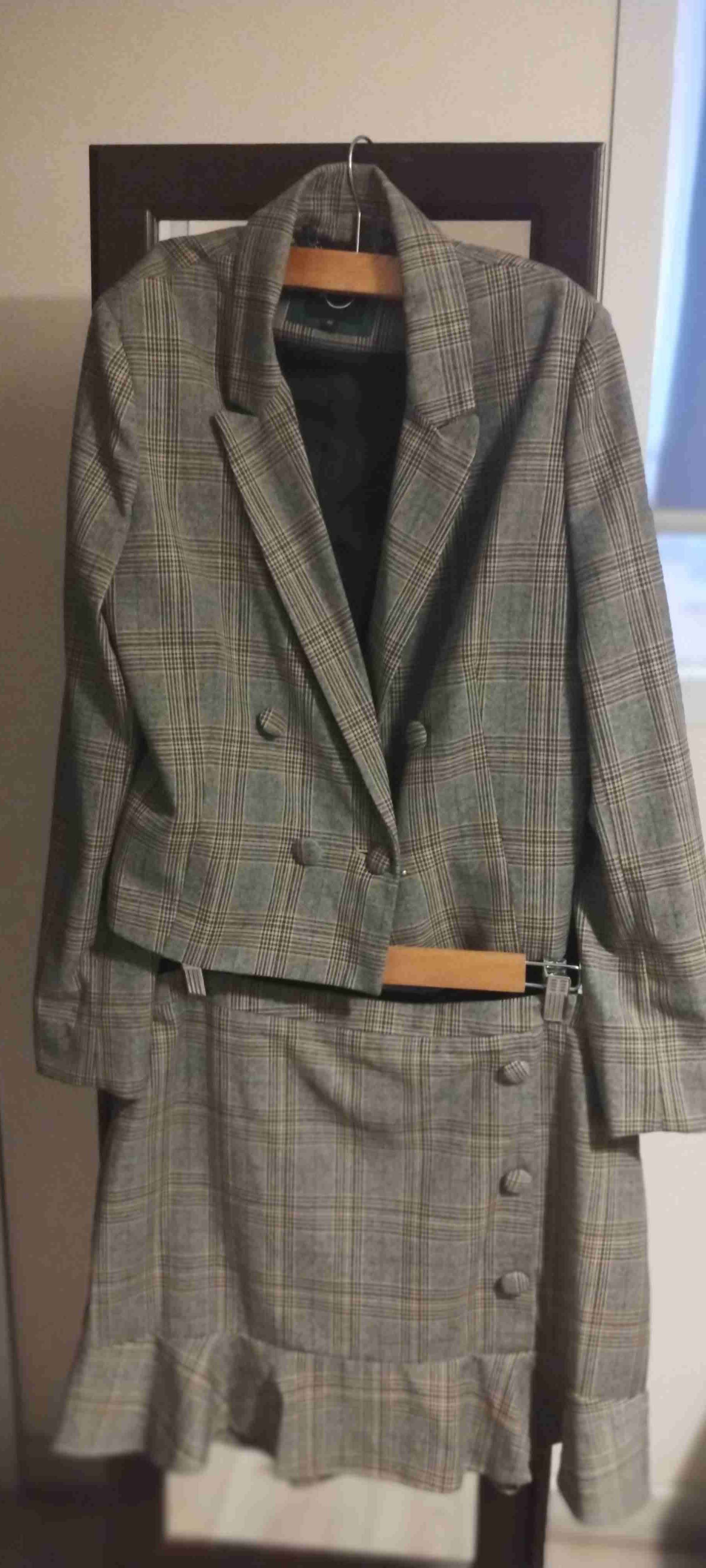 Elegante conjunto de blazer y falda con diseño a cuadros. Ideal para ocasiones formales. En buen estado con leves signos de uso.talla 40 pequeña