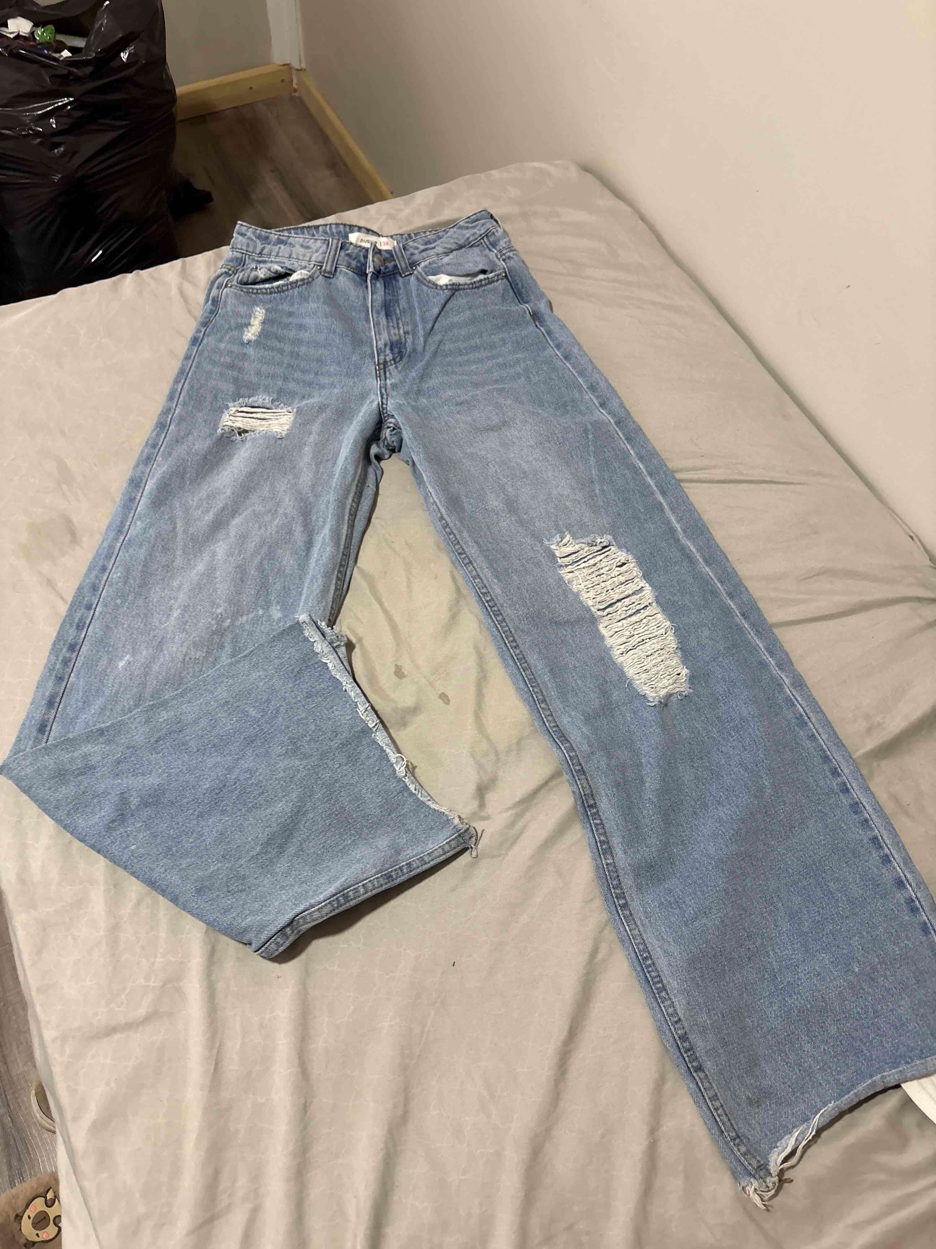 Jeans azul claro con diseño desgastado y roturas elegantes. En buen estado general, ideal para un look casual.