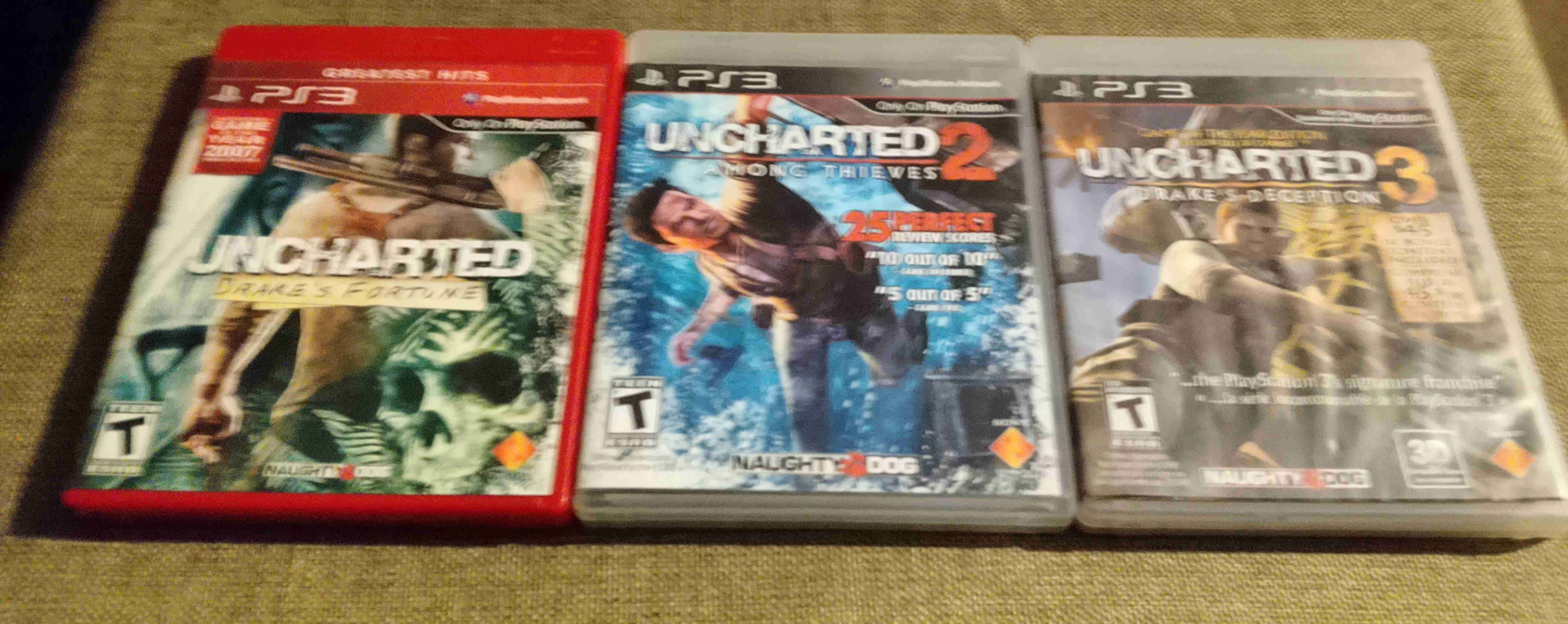 Trilogía de juegos Uncharted para PS3 en buen estado. Ideal para fanáticos de la acción y la aventura.