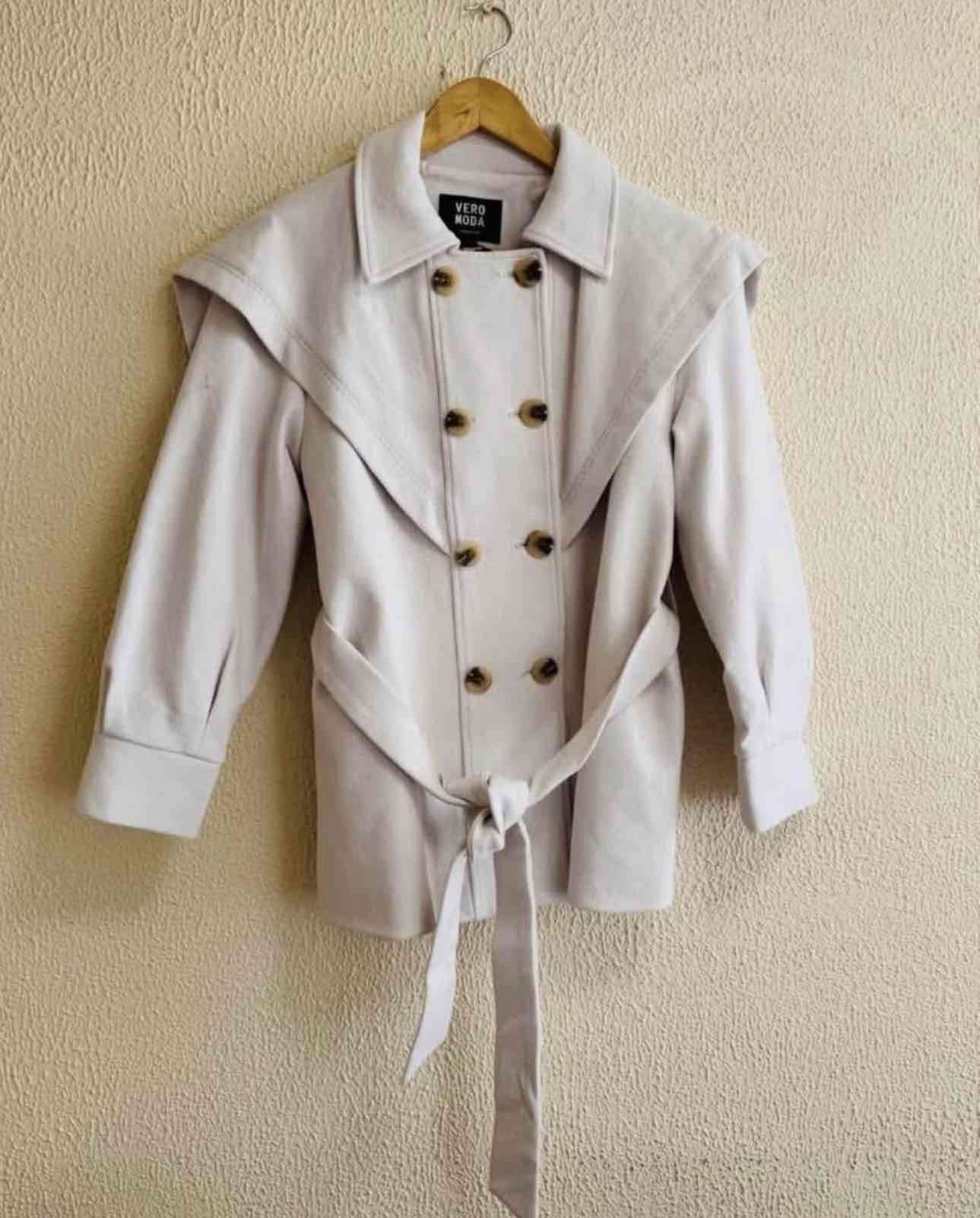 Abrigo beige de estilo clásico con doble botonadura y cinturón. Ideal para invierno, buen estado general.
