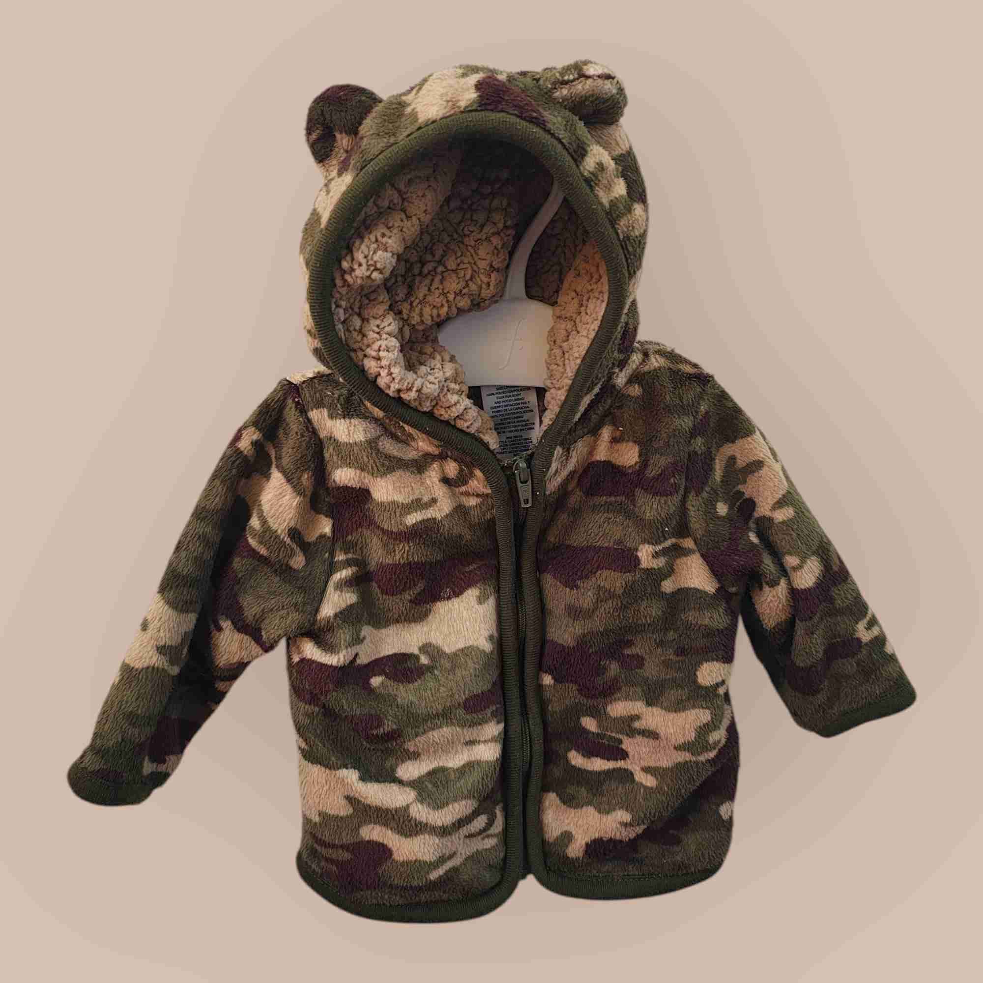 Chaqueta de bebé estilo camuflaje, suave y abrigadora con orejitas en la capucha. Perfecta para días fríos.