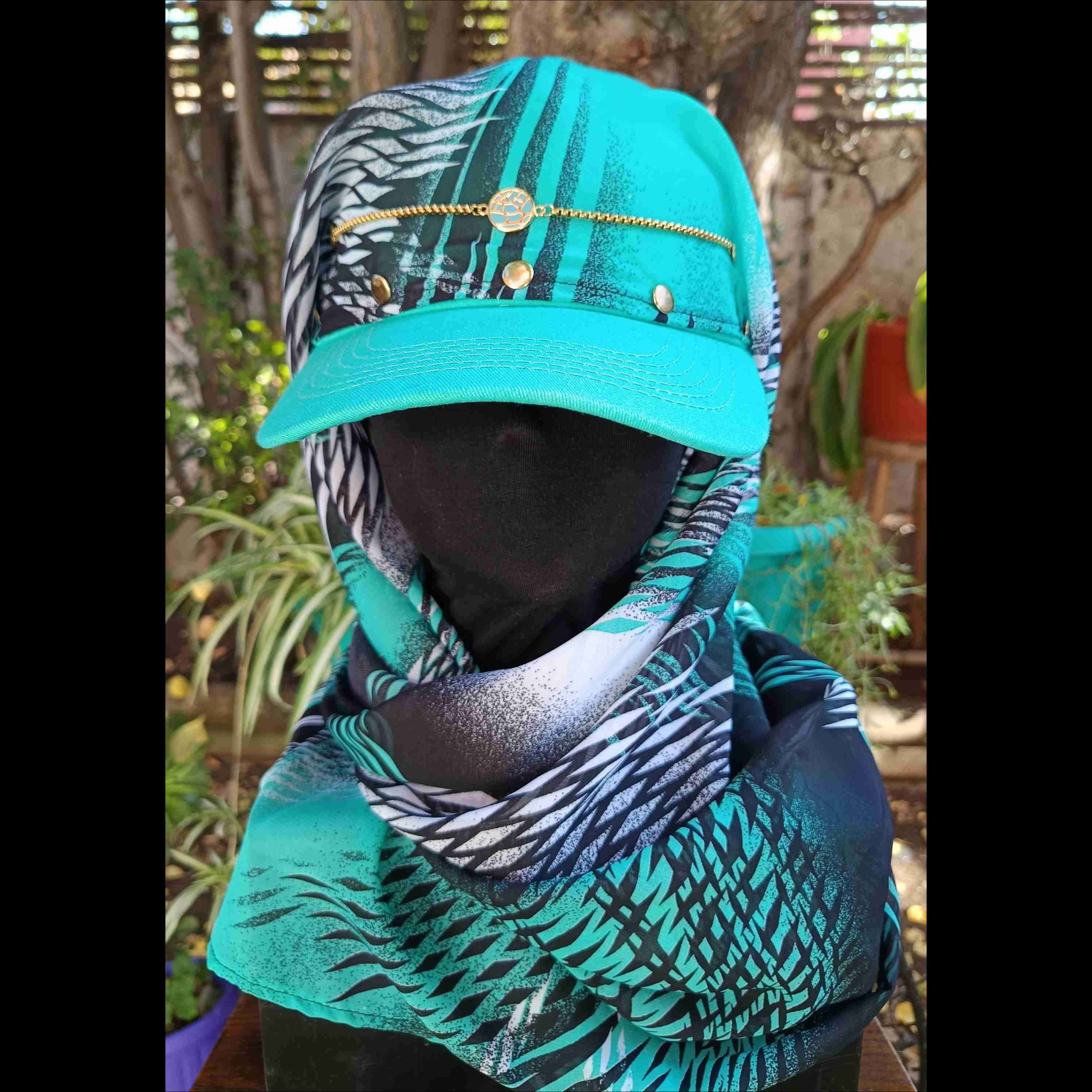 Jockey con pañuelo largo color turquesa con cadena. Estilo moderno, ideal para todas las estaciones del año.