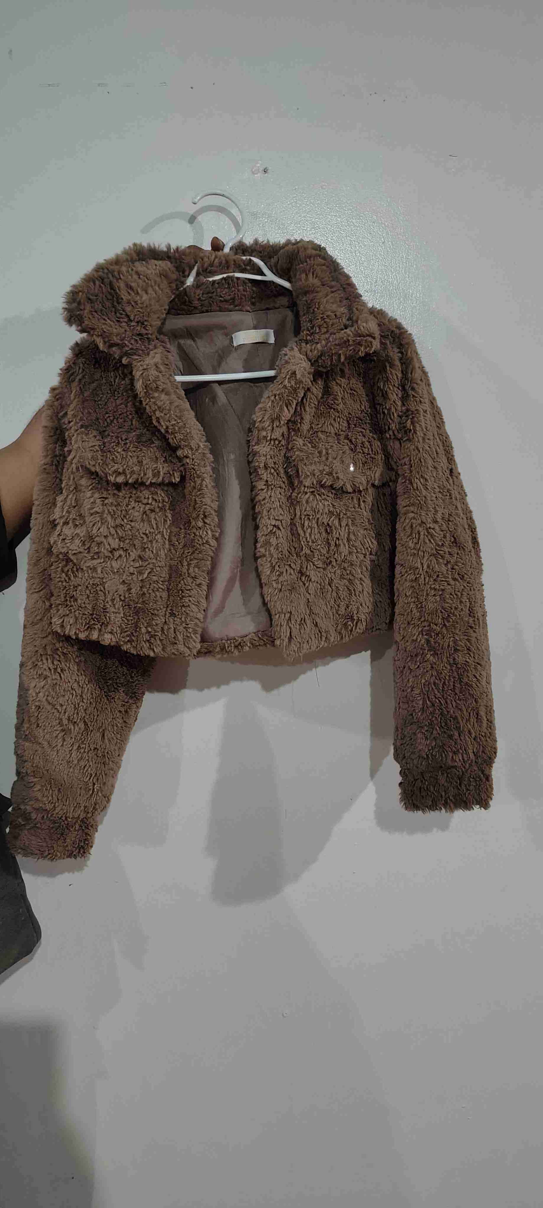 Chaqueta corta de pelaje sintético en color marrón, ideal para días fríos. En buen estado con detalles de uso leves.