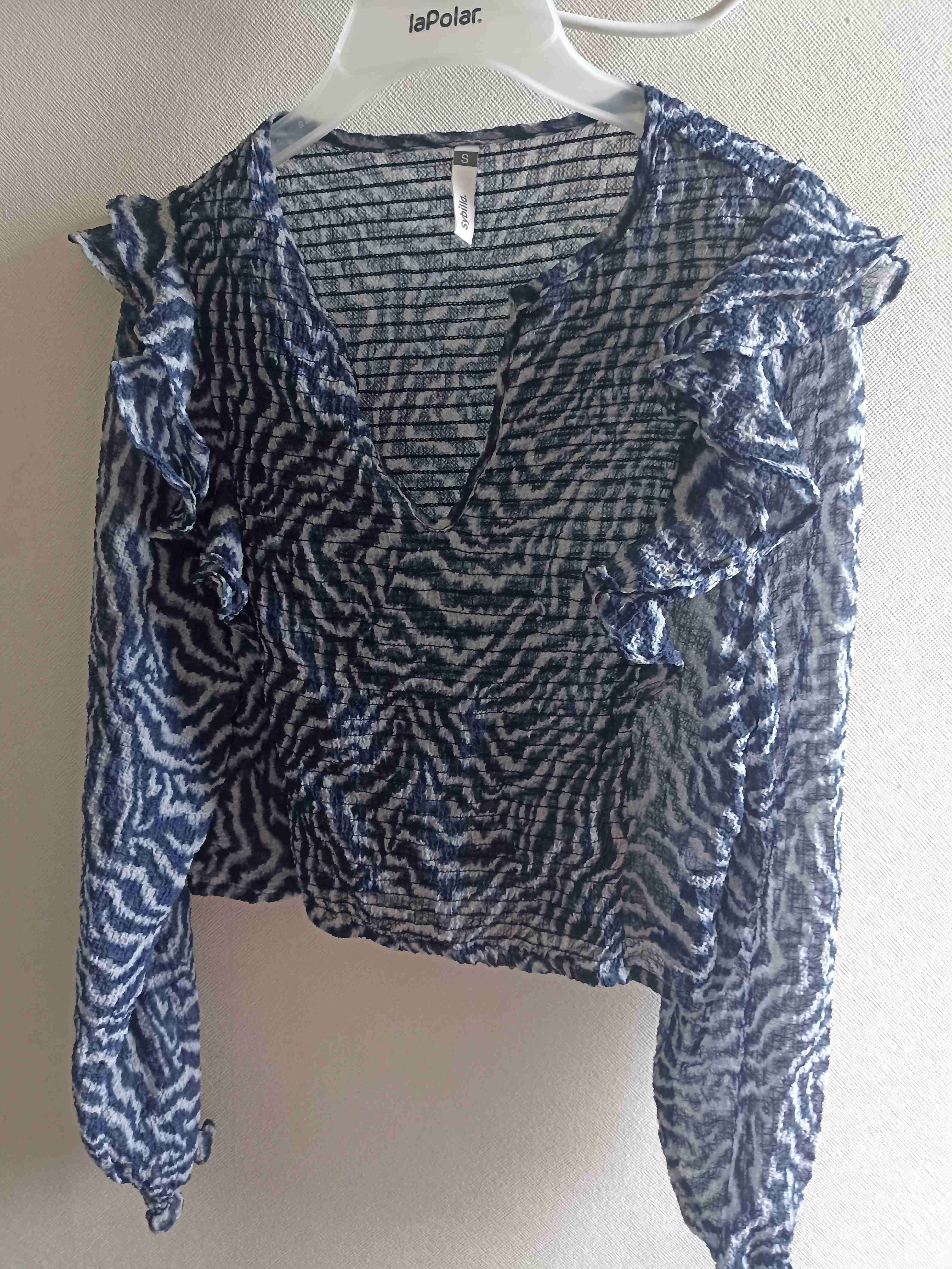 Blusa azul con detalles de volantes, ideal para el verano. En buen estado y con patrón llamativo.