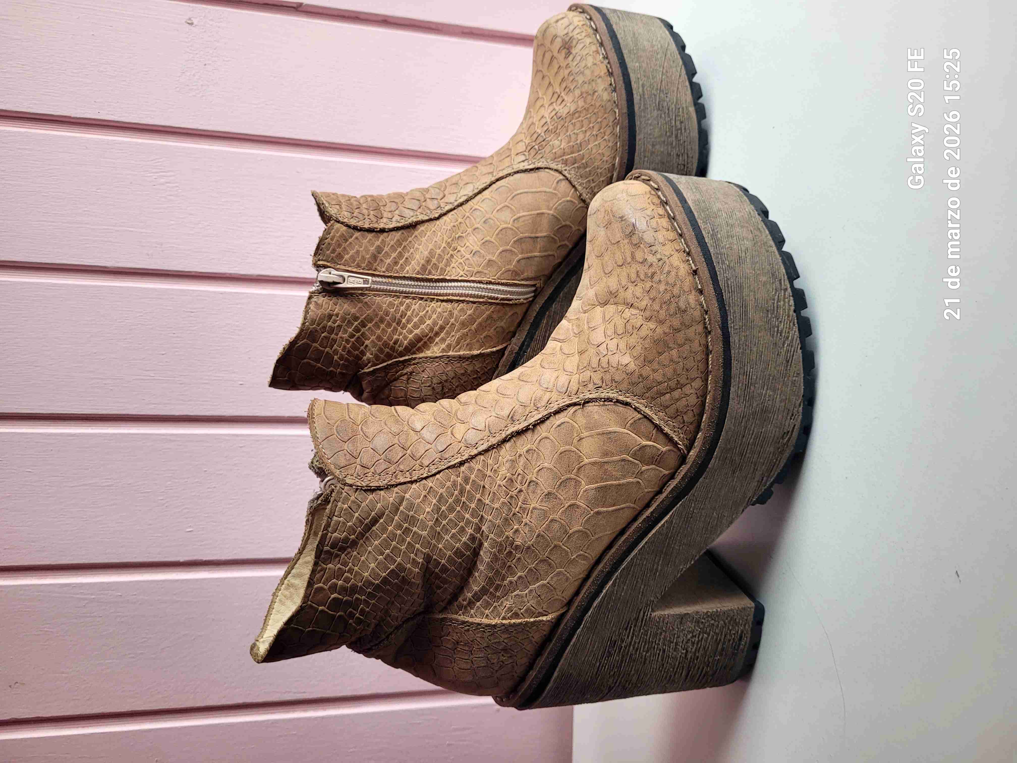 Botines de cuero marrón con suela gruesa y textura de reptil. Perfectos para un look audaz y moderno.