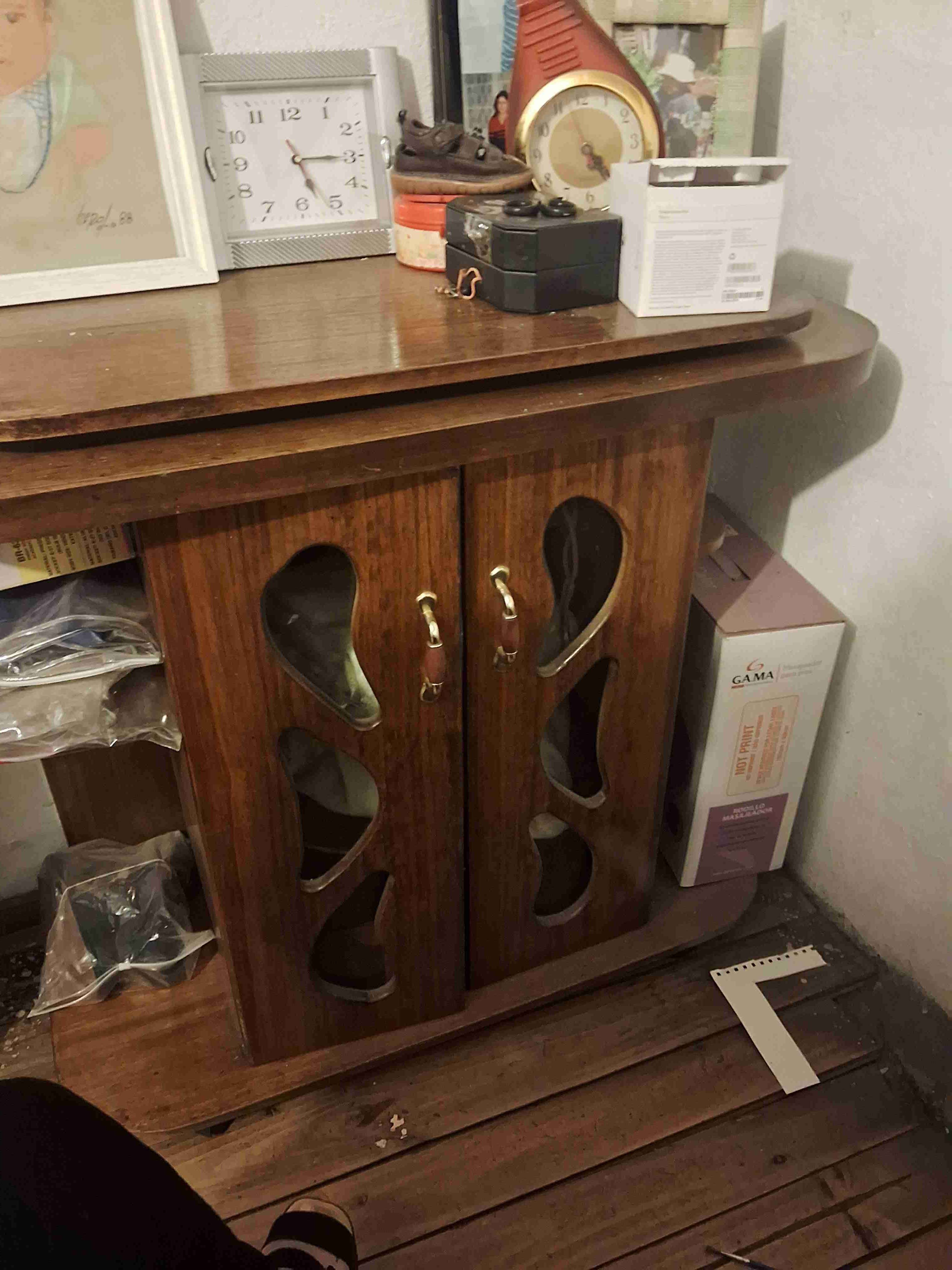 Pequeño mueble de madera oscuro con puertas decorativas. Ideal para almacenar objetos en el hogar.En perfecto estado, se mueve la bandeja para donde se necesite tener.