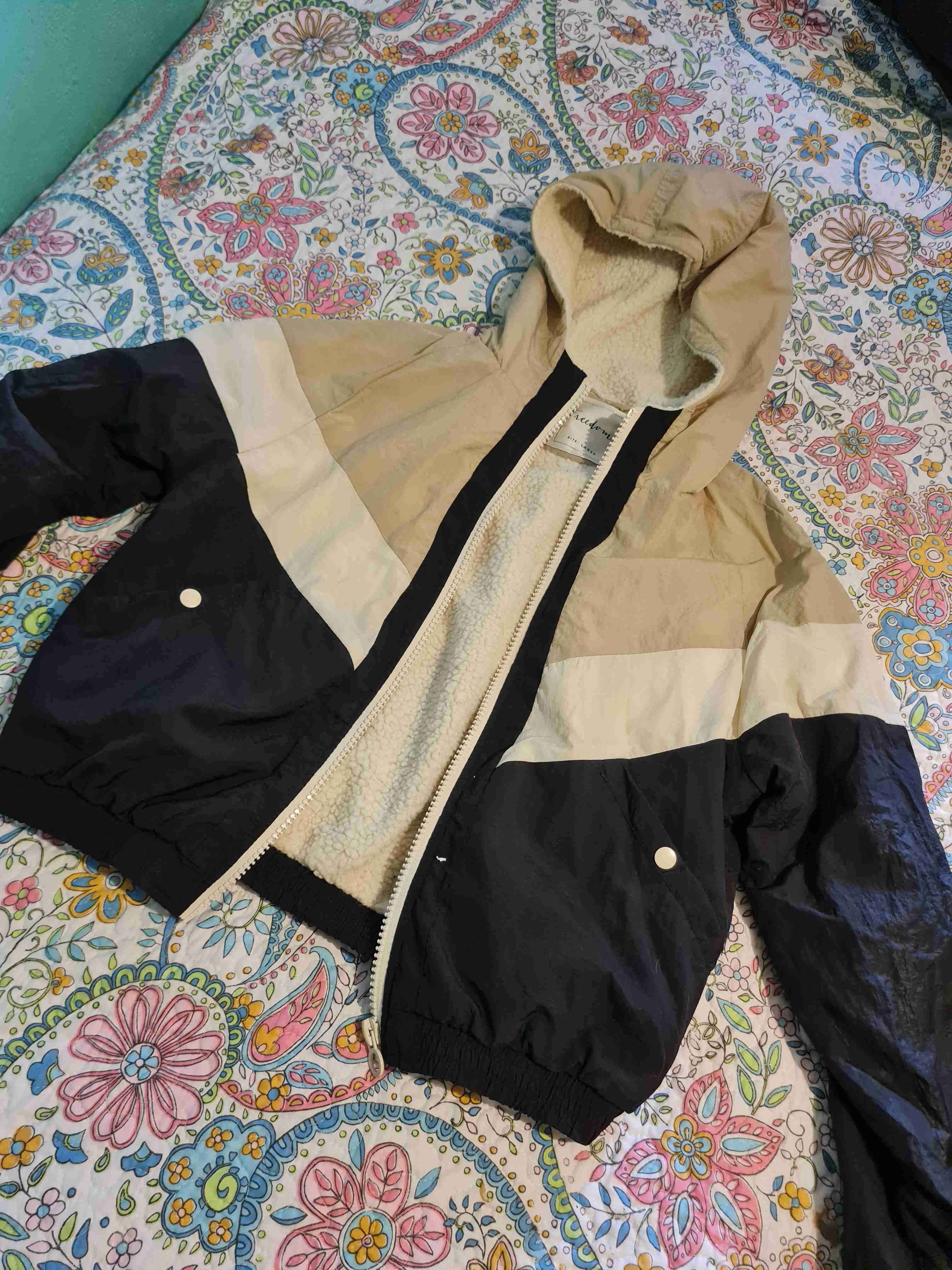 Chaqueta con diseño bicolor y capucha, ideal para días frescos. En exelente estado. Talla M/L