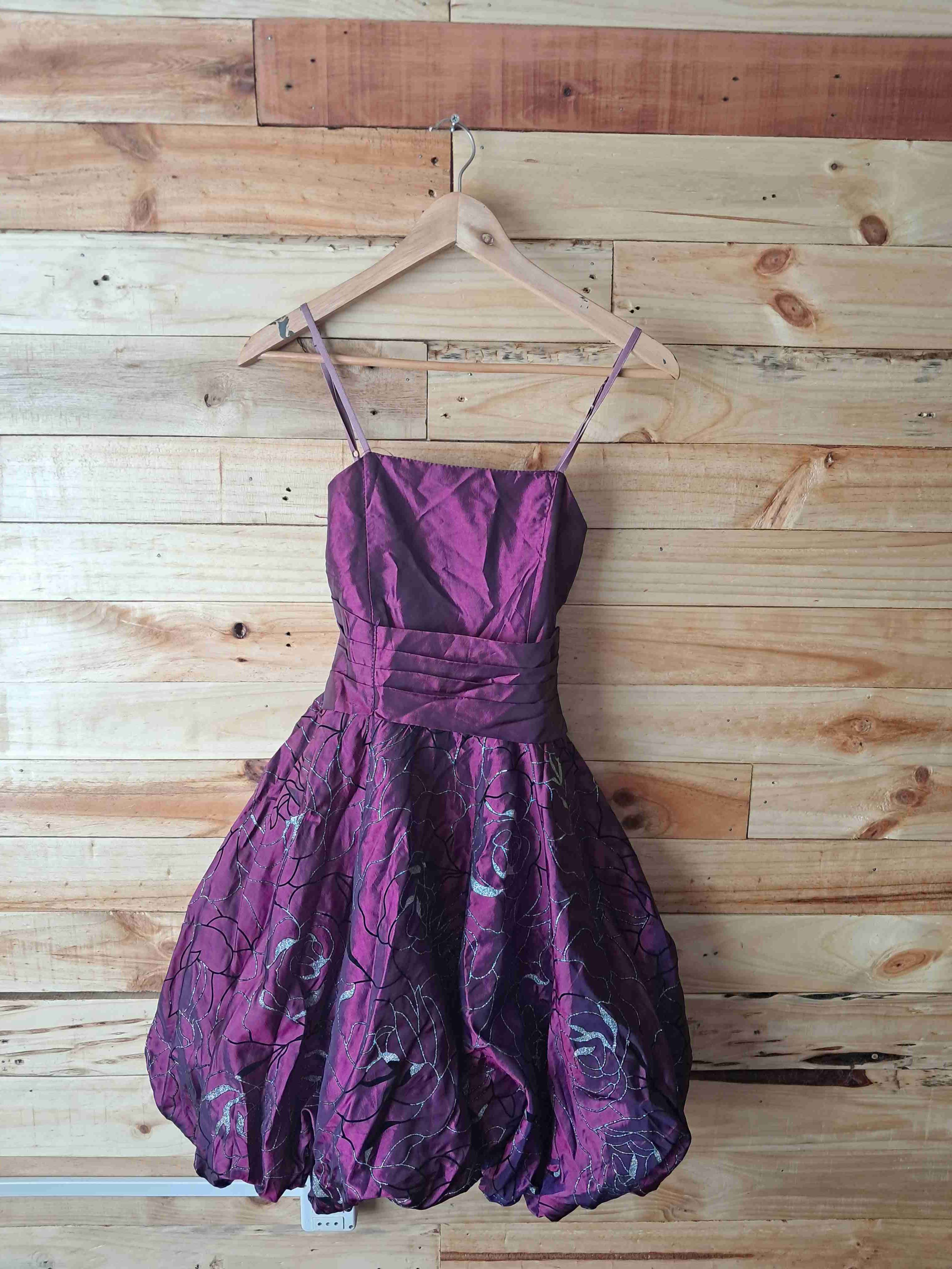 Elegante vestido morado con tirantes, diseño floral ideal para fiestas. En buen estado.