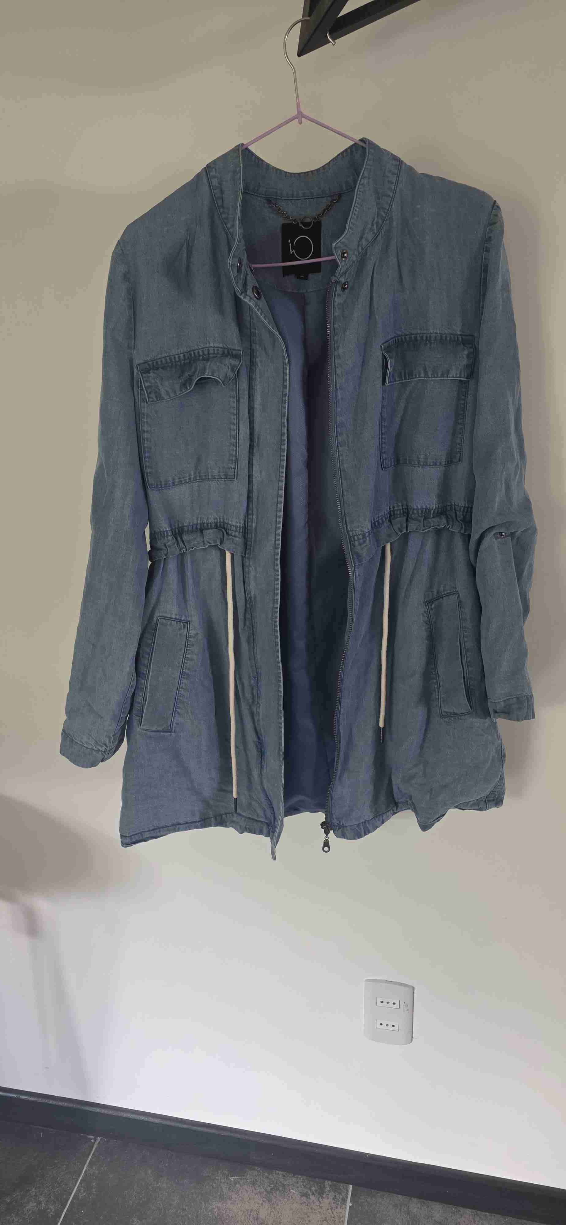 Esta prenda es una chaqueta de denim ligera (o parka de mezclilla) con un diseño de estilo utilitario. Se caracteriza por su cintura con cordón ajustable, cierre frontal (posiblemente con botones a presión o cremallera oculta) y bolsillos tipo parche en el pecho. El diseño incluye mangas largas con detalles de trabilla para remangarlas, lo que la hace versátil para distintas temperaturas