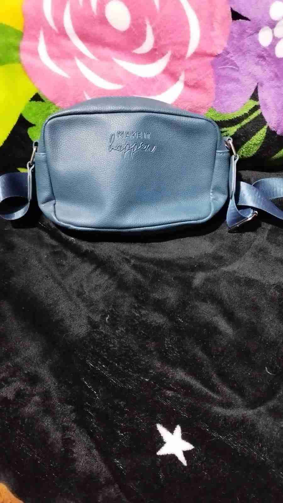 Riñonera moderna color azul con la frase 'Make it happen'. Ideal para uso diario, con correa ajustable.