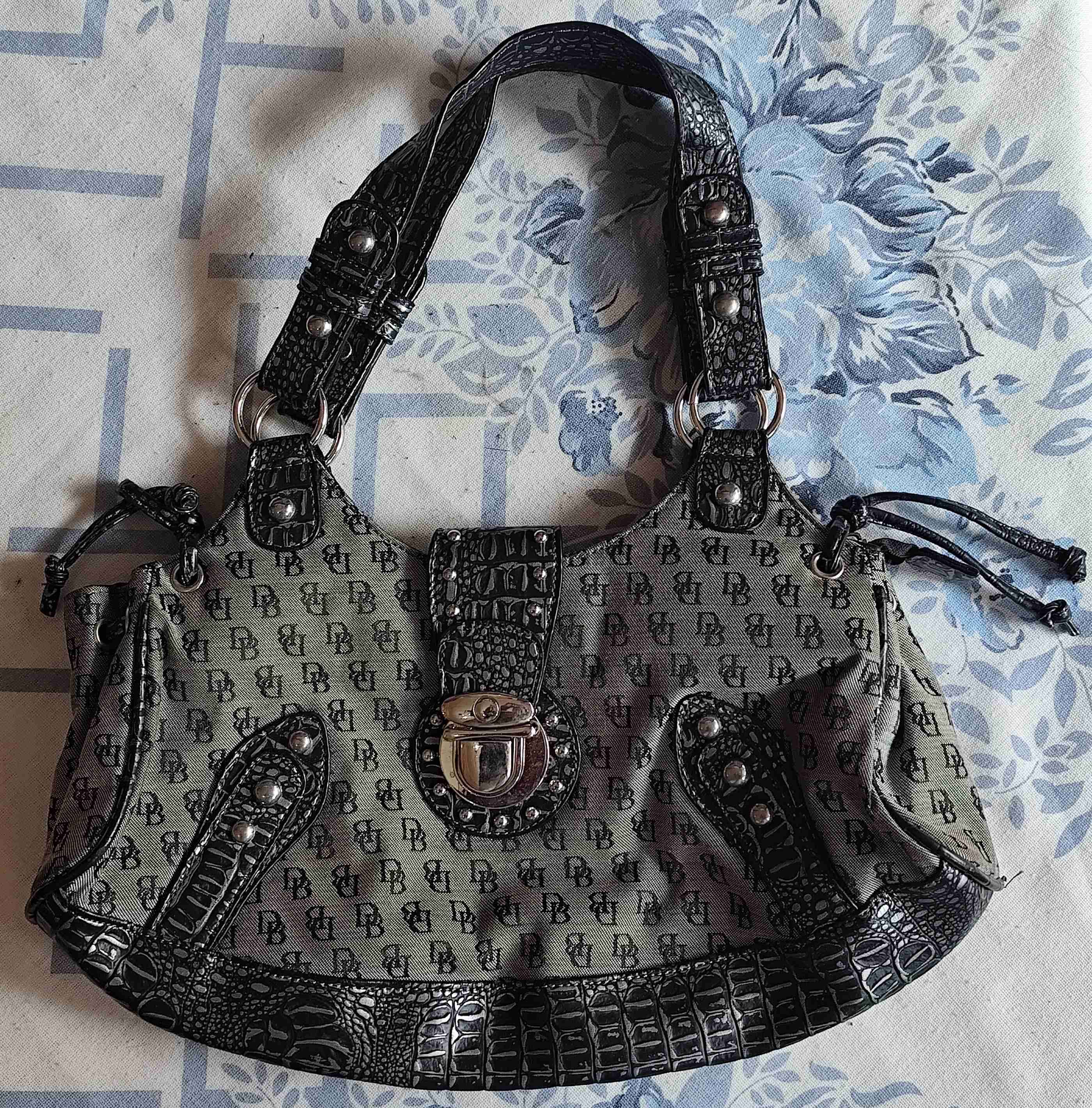 Elegante bolso de mano con diseño estampado gris y detalles en negro. Ideal para salidas casuales o eventos formales.Medidas largo 35cm, alto17cm, ancho 10cm está nuevo pero no tiene etiqueta.