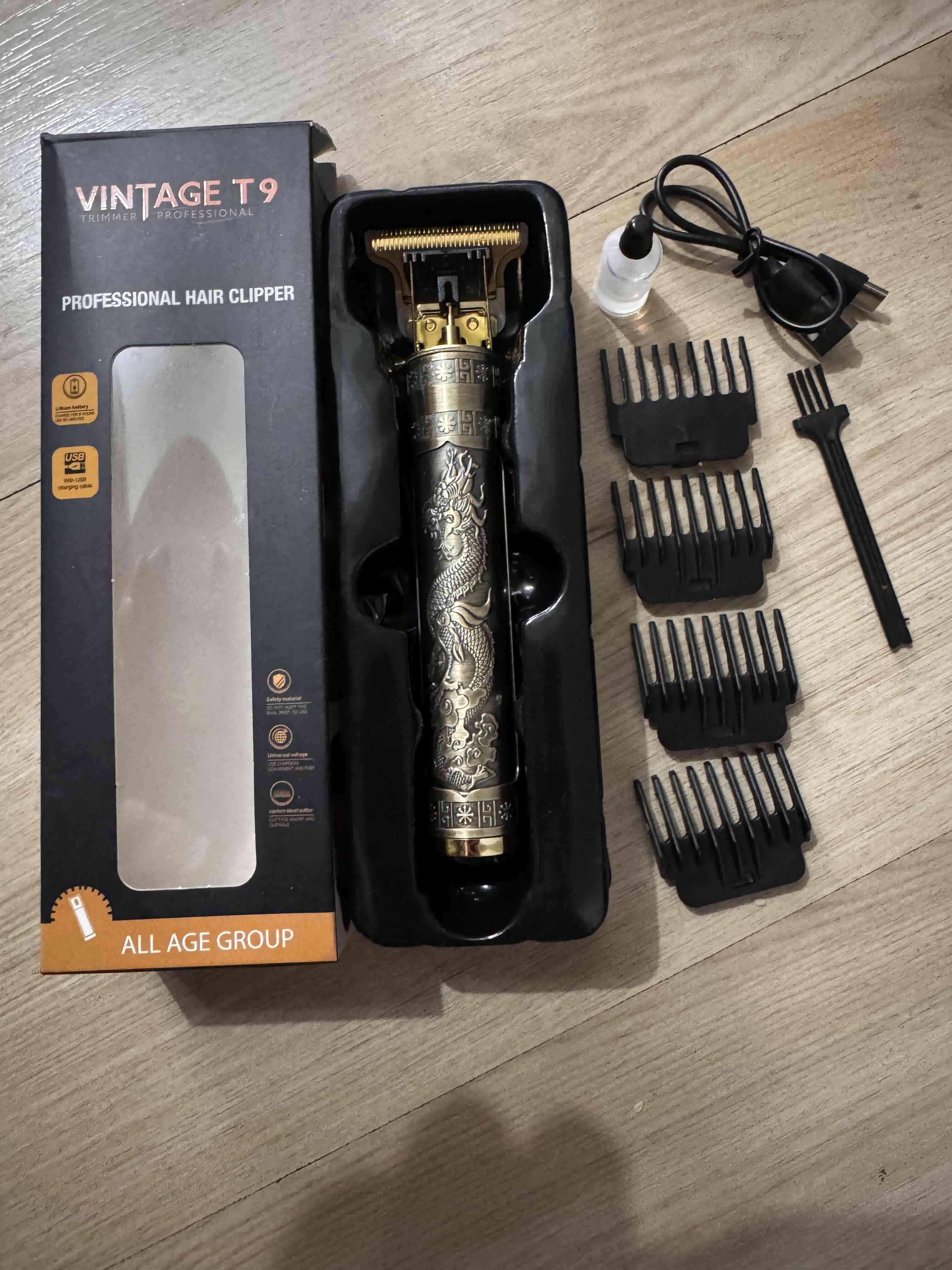 Máquina Profesional Vintage T9 - diseño metálico Premium, con diseño de dragón.. ¡Nueva en Caja! Ideal para contornos, patillas y degradados precisos. Estado: Nueva Incluye: 4 peines guía, cable USB tipo C para cargar-cepillo de limpieza y aceite. Carga: Inalámbrica y recargable