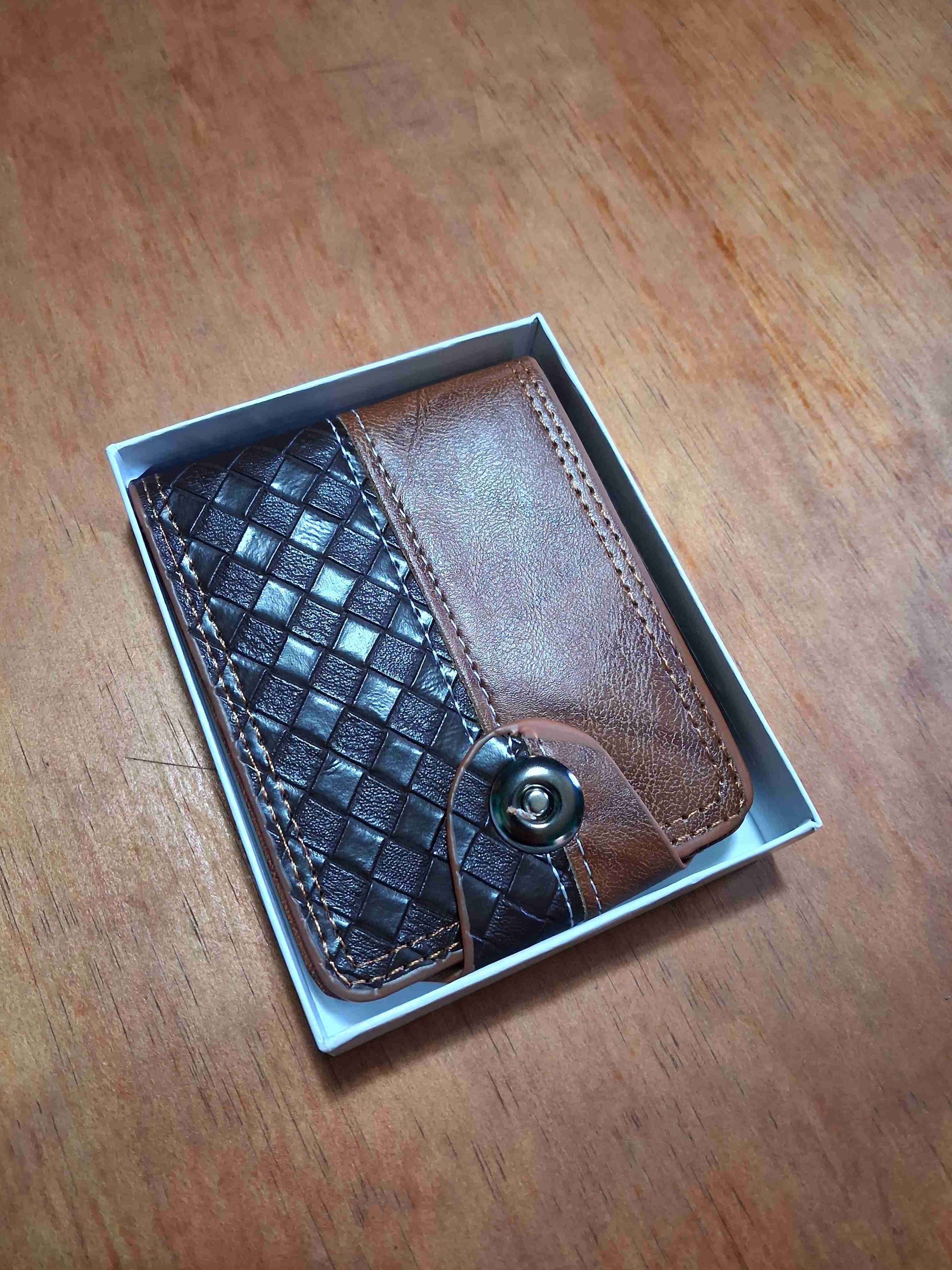 Elegante billetera de cuero marrón con diseño tejido, ideal para uso diario.