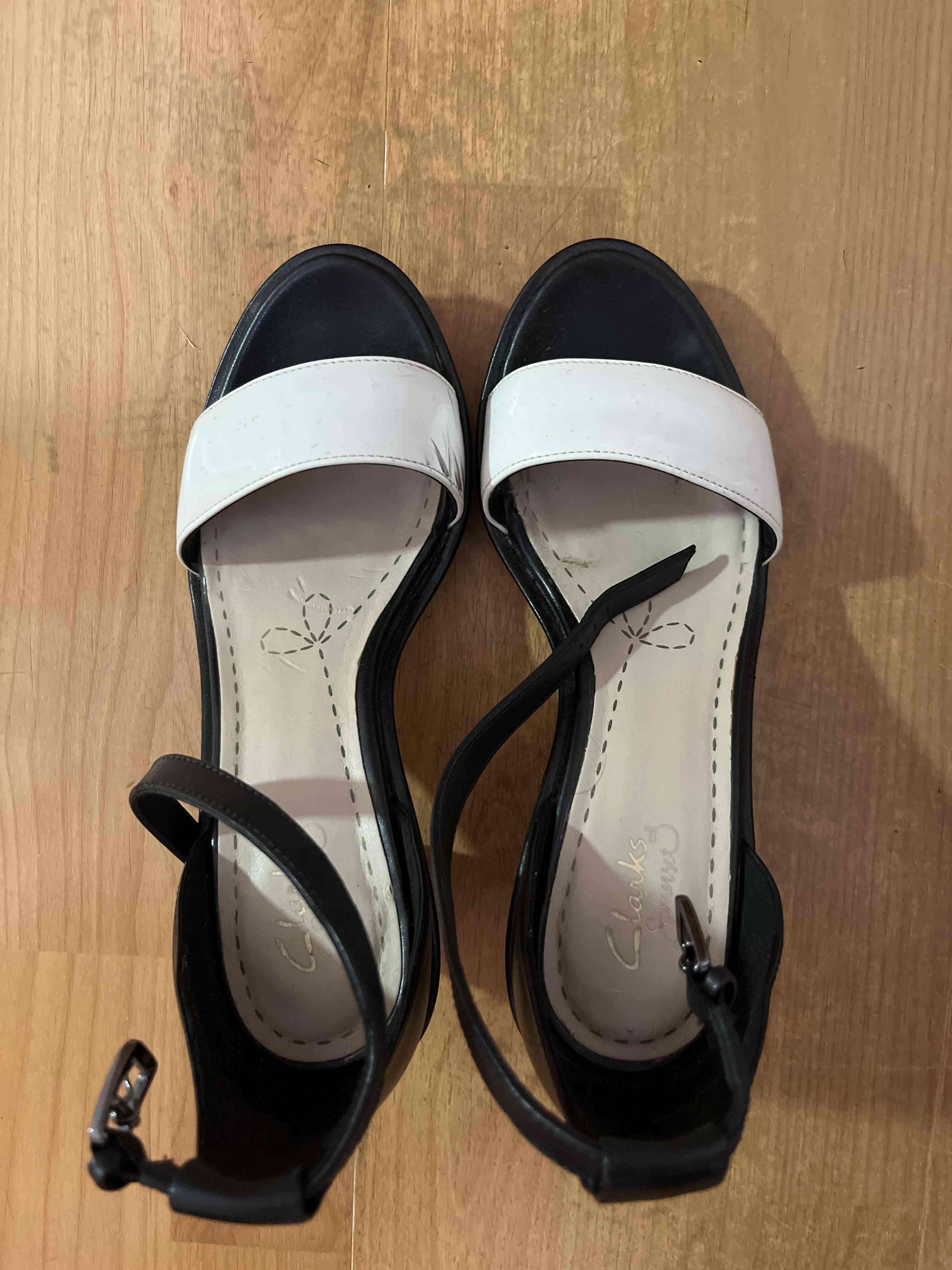 Elegantes sandalias Clarks en blanco y negro, perfectas para ocasiones formales o casuales. Buen estado con uso ligero.