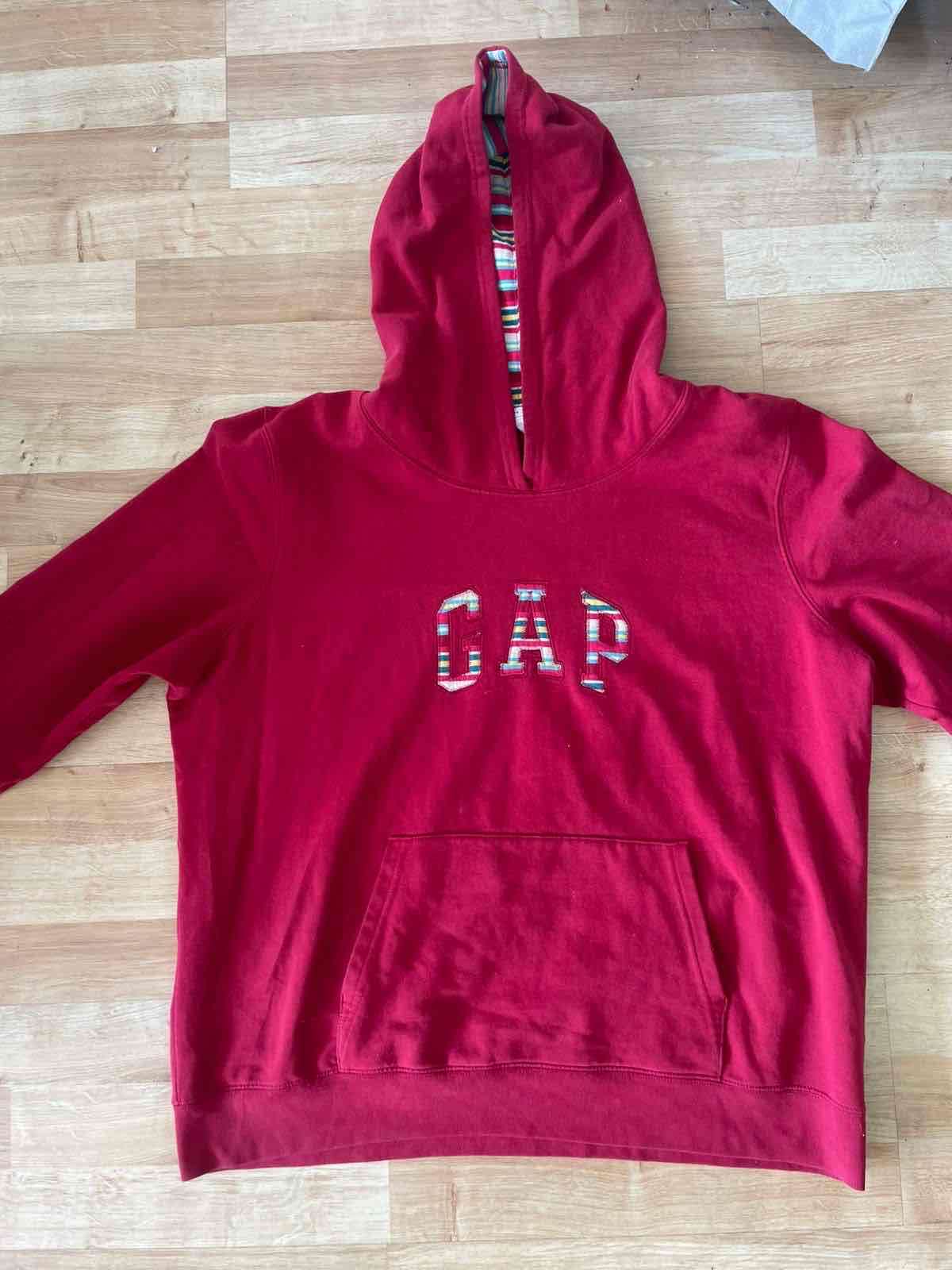 Polerón rojo GAP con capucha y bolsillo canguro. Ideal para uso casual. Talla XXL. Presenta pequeña mancha en bolsillo frontal.