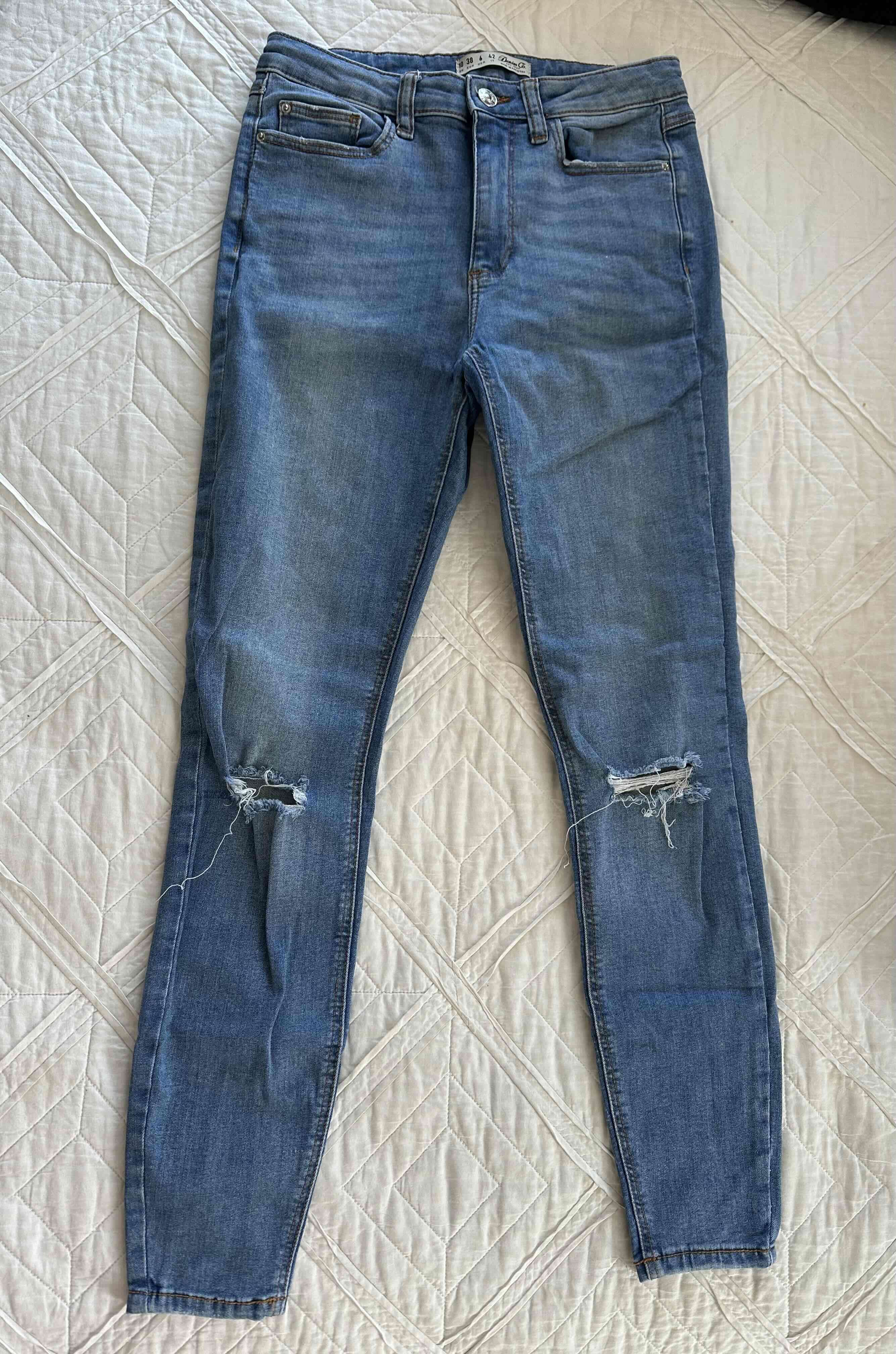 Jeans azul con estilo desgastado en las rodillas. Perfectos para un look relajado y urbano.