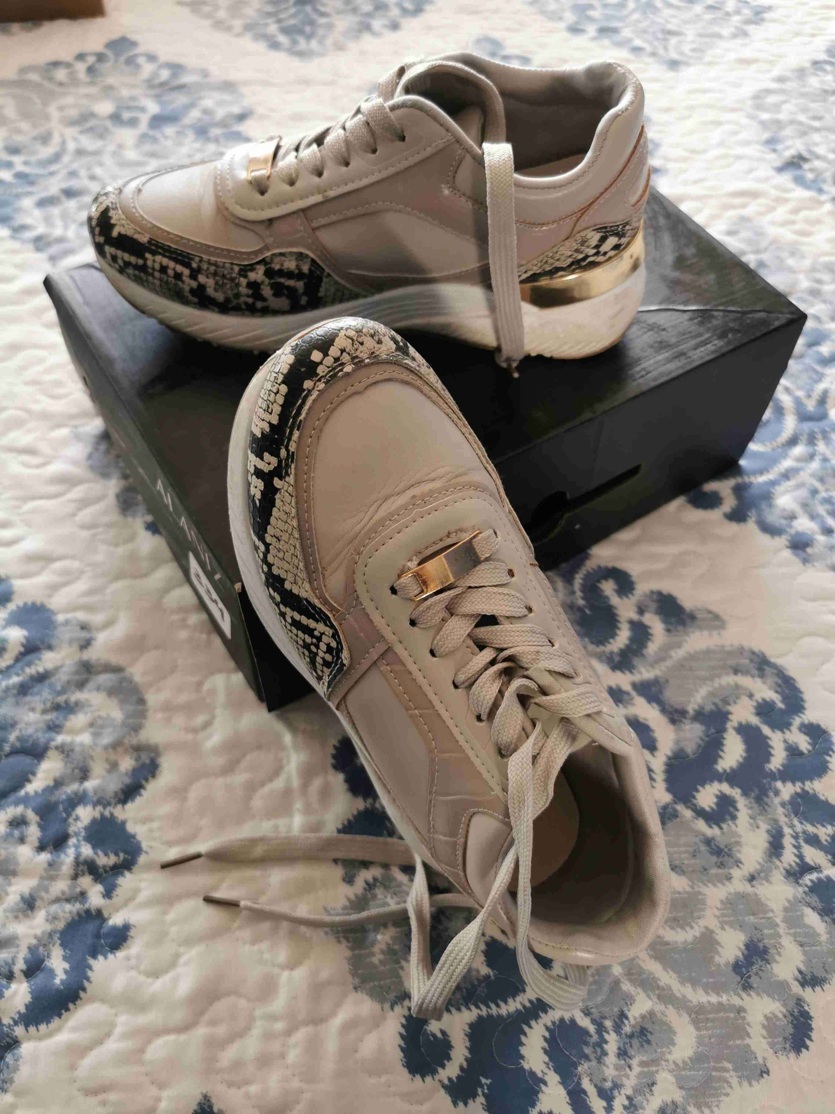 Zapatillas deportivas en color beige con detalles dorados y estampado animal print. En buen estado, elegantes y cómodas para uso casual.