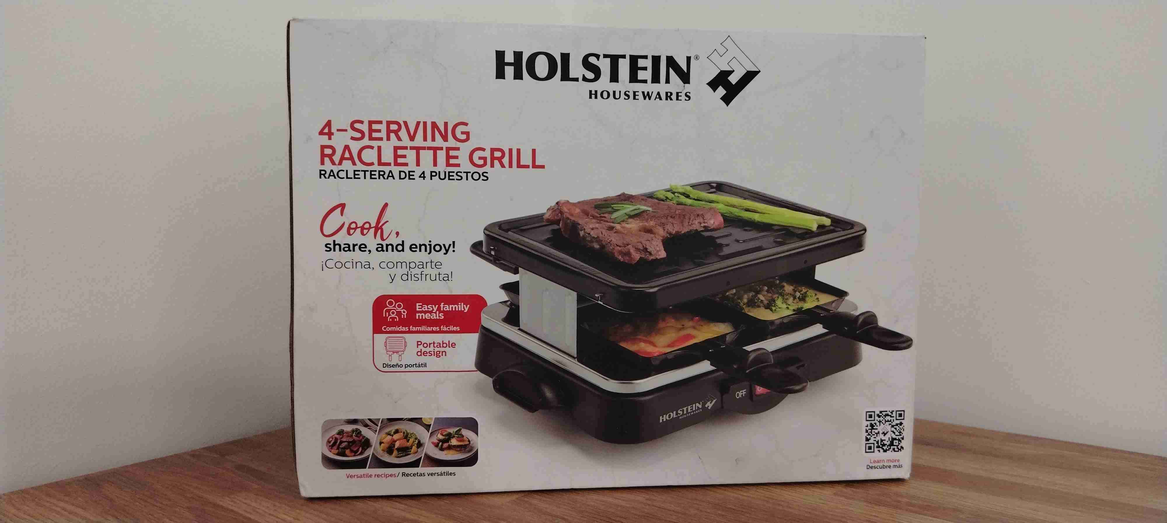 Racletera de 4 puestos ideal para comidas familiares. Diseño portátil y fácil de usar. Perfecta para disfrutar y compartir.