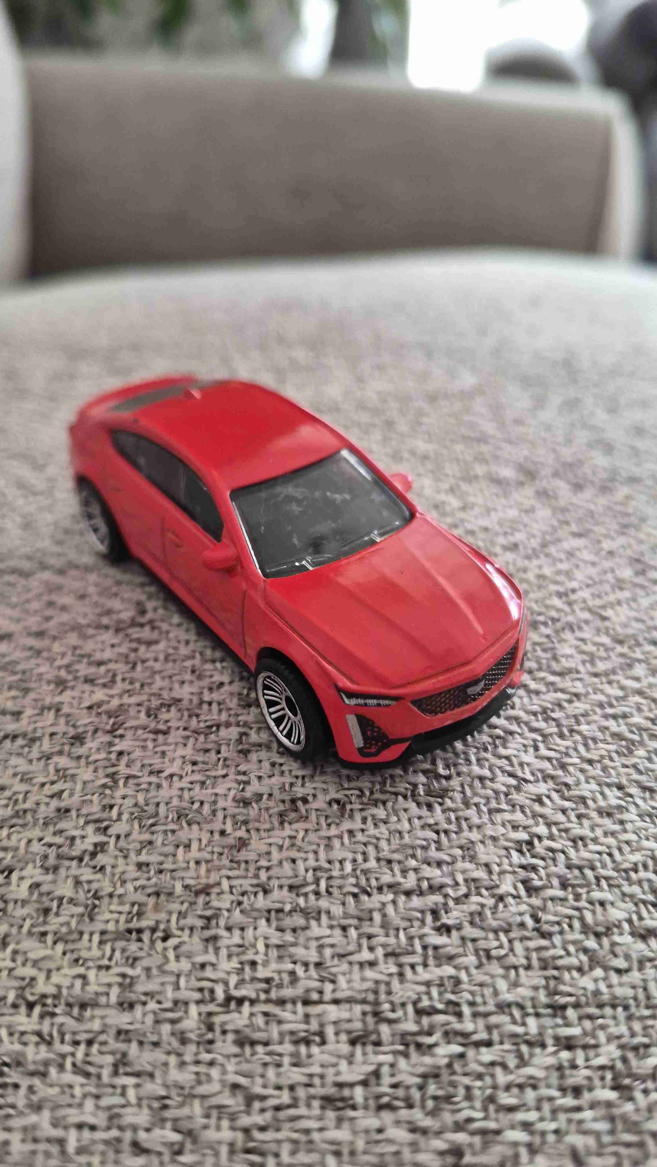 Auto de juguete a escala en color rojo, ideal para coleccionistas o niños.