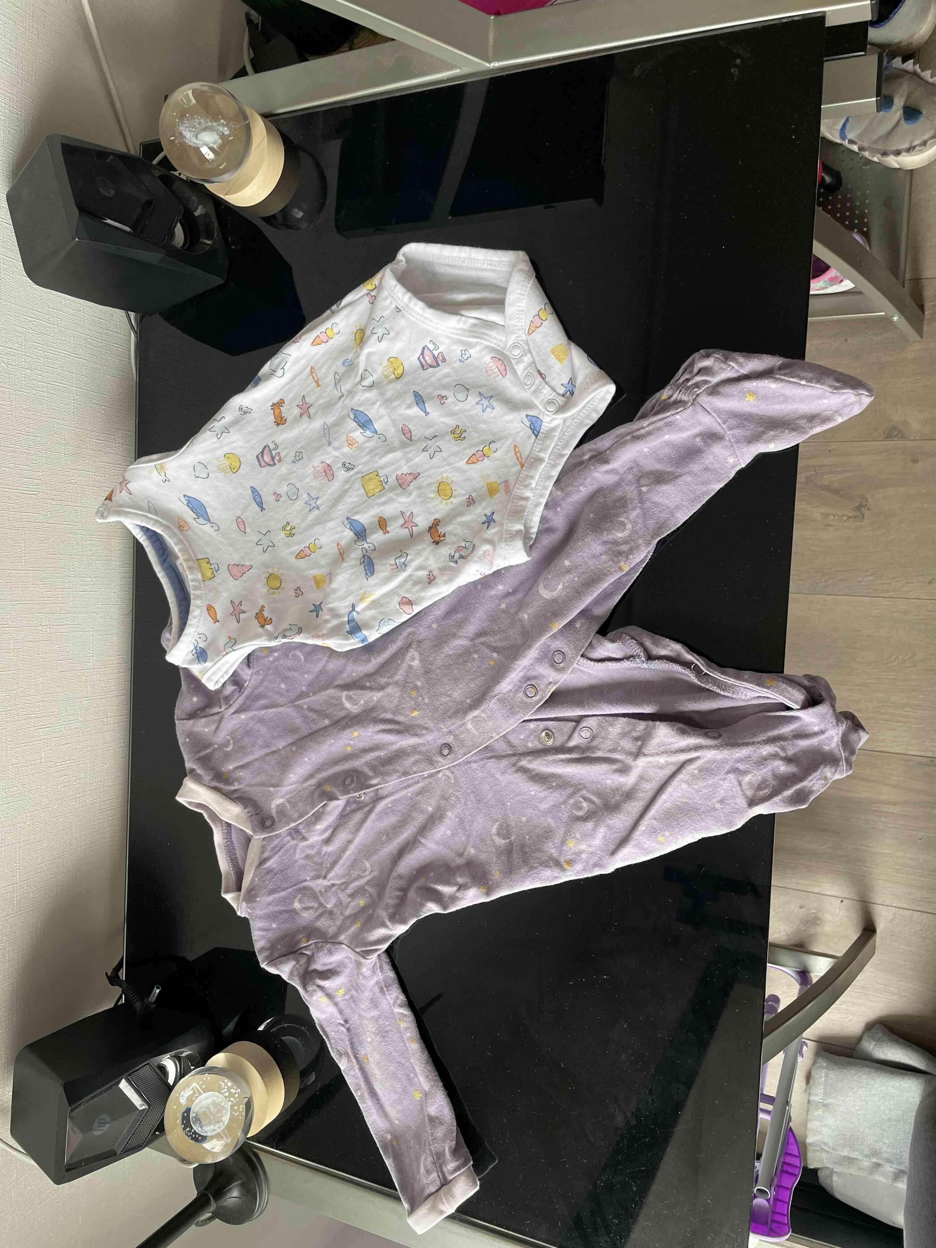 Conjunto de pijamas de bebé, color lila y blanco con estampados divertidos. En buen estado, ideal para dormir cómodamente.