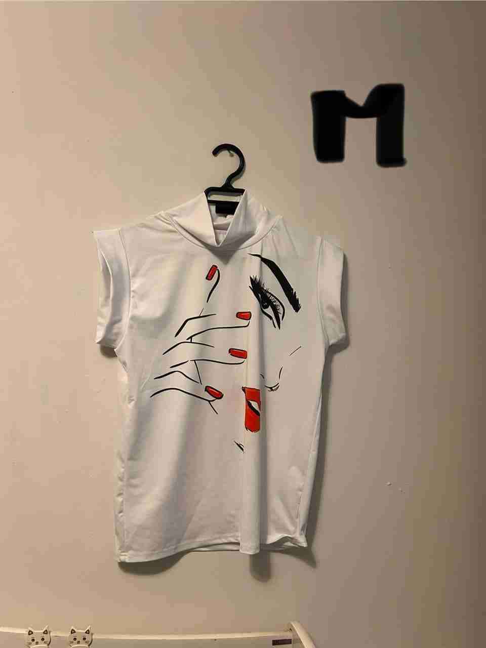 Polera blanca sin mangas con diseño de rostro. Talla M, es larga y elastica