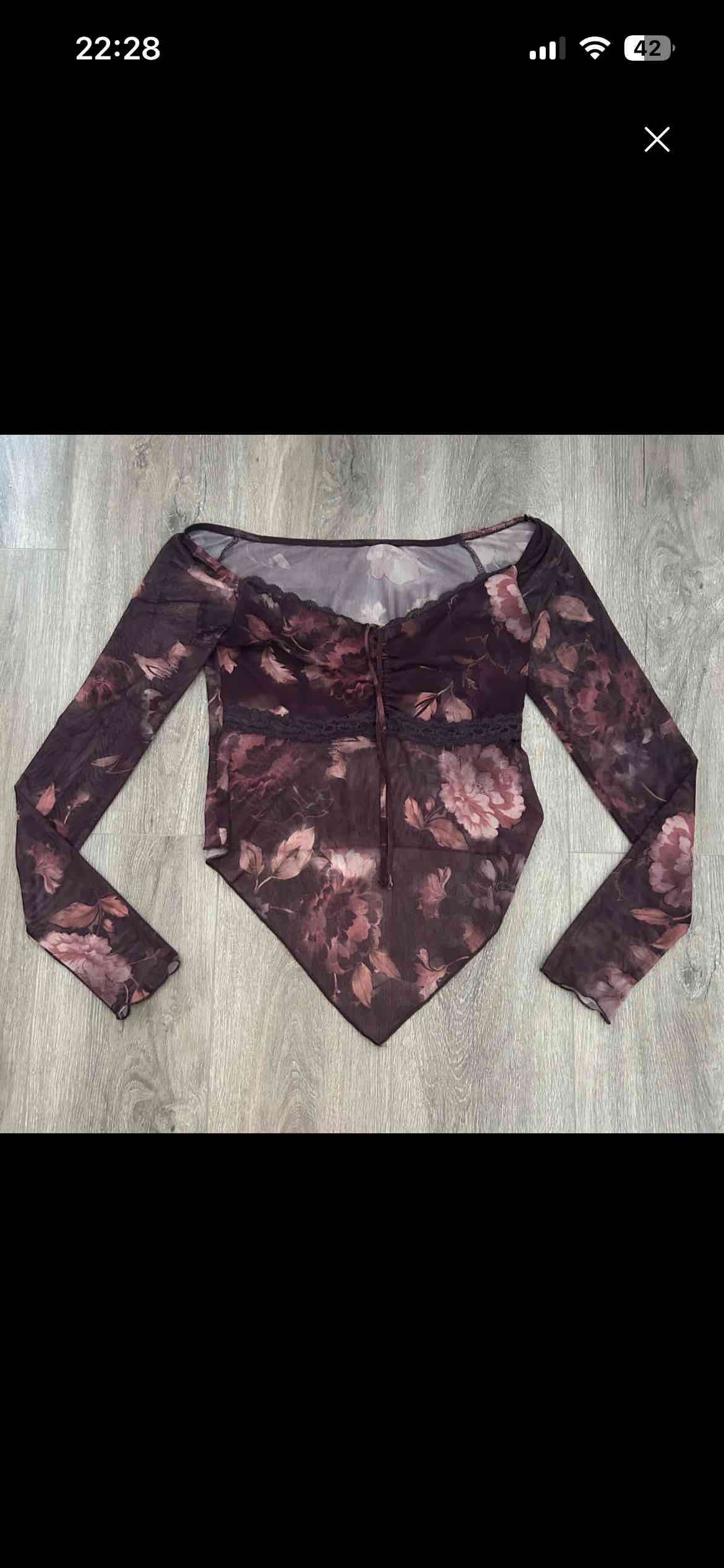 Blusa de mujer con diseño floral en tonos oscuros, ideal para salidas casuales. En buen estado con leve transparencia y ajuste en la cintura.tiene un pequeño agujero en la parte de la punta.
