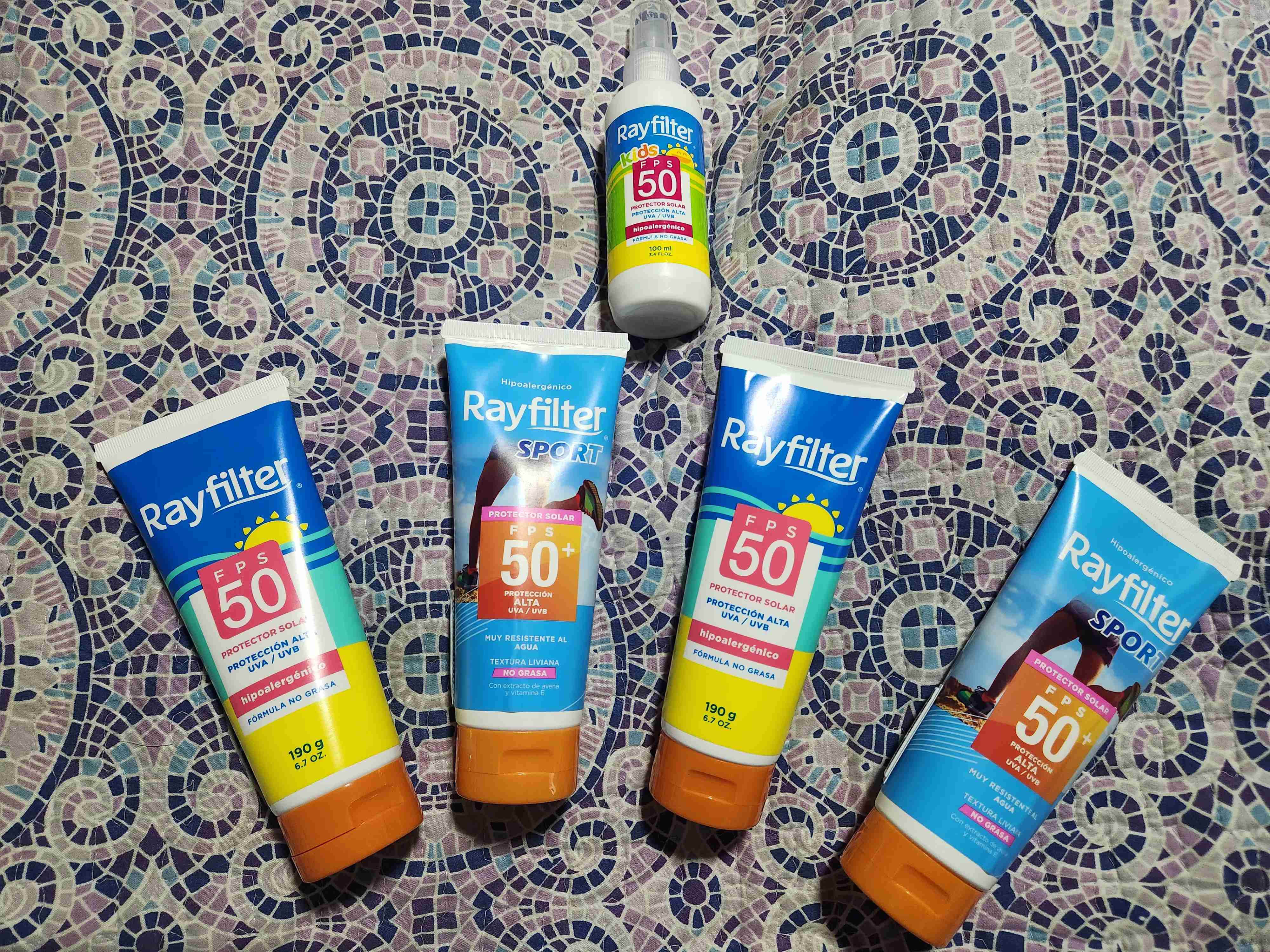 Variedad de bloqueadores solares Rayfilter con FPS 50+, 190 grs. Protege tu piel durante el día. En buen estado.