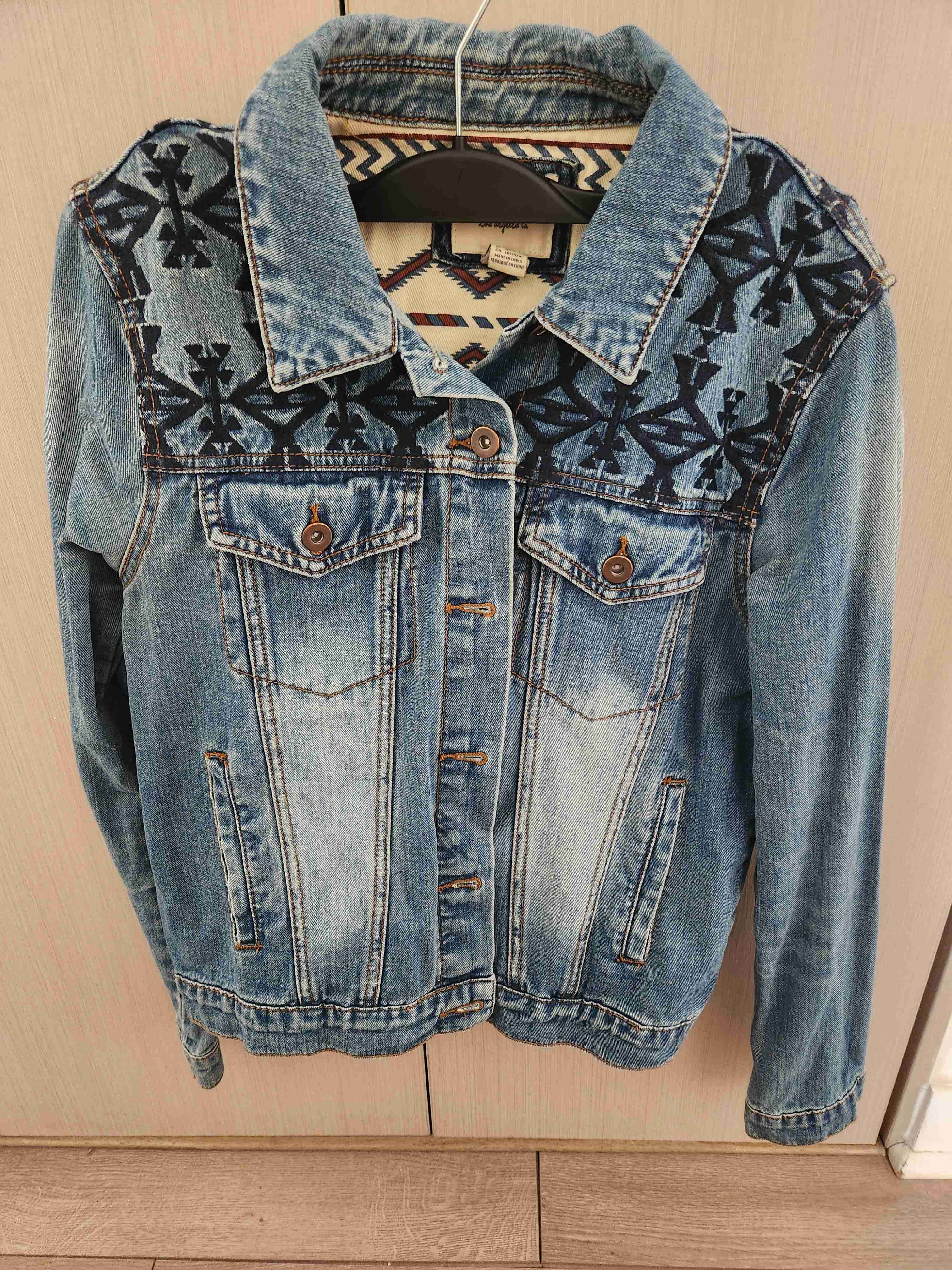 Chaqueta de mezclilla azul con estampado frontal original. Ideal para uso casual, en buen estado.