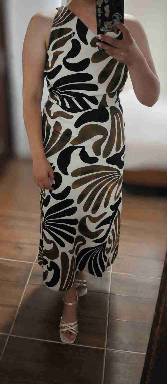 Vestido elegante con estampado de hojas en tonos beige y negro, marca mango. Perfecto para eventos formales. Buen estado, solo un uso.