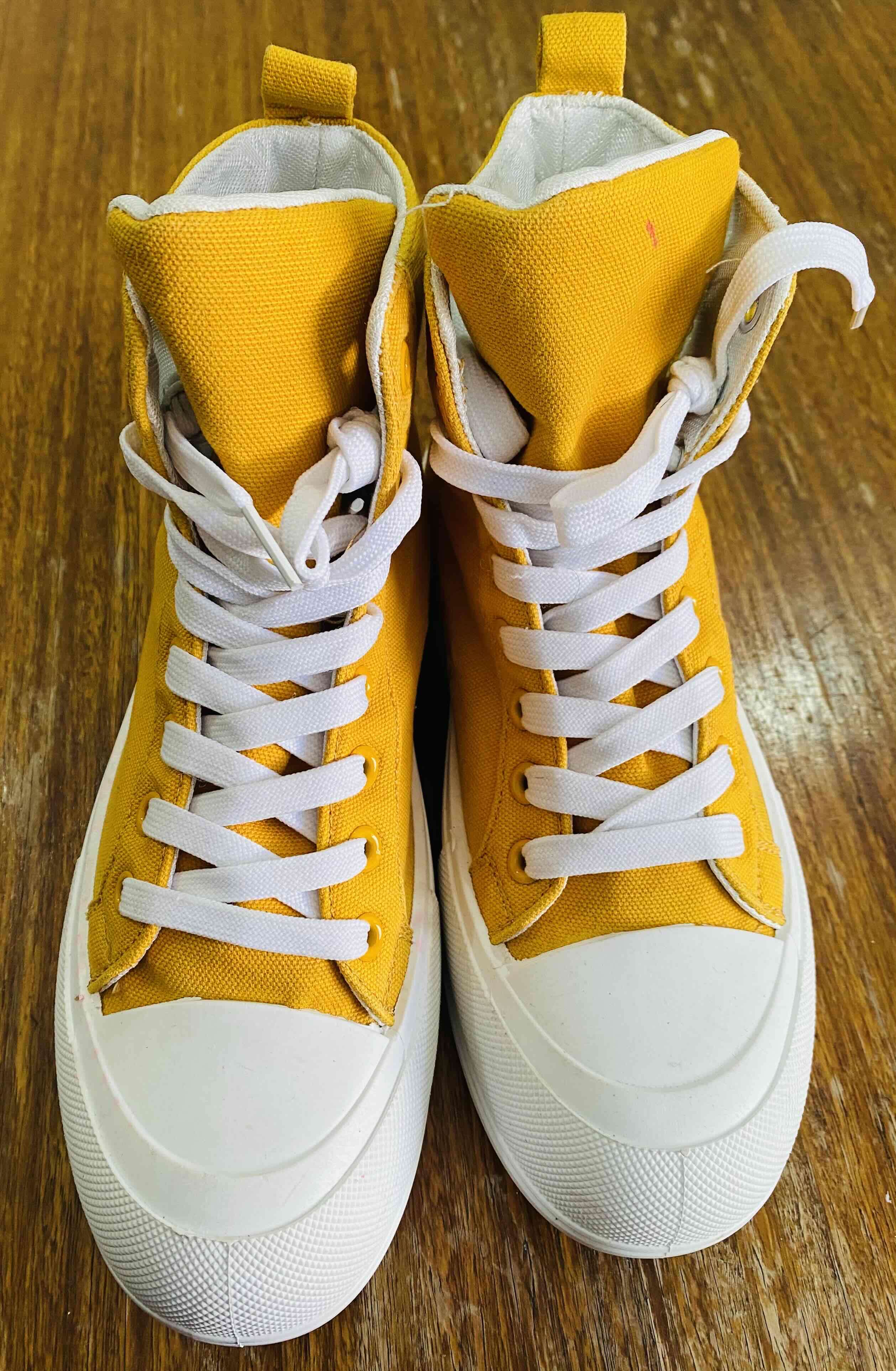 Zapatillas altas en color amarillo con cordones blancos. Perfectas para un look casual y moderno.