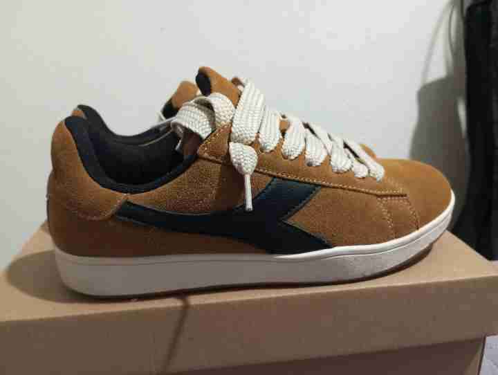 Zapatillas casuales color café con detalle azul y cordones blancos. Perfectas para el uso diario.