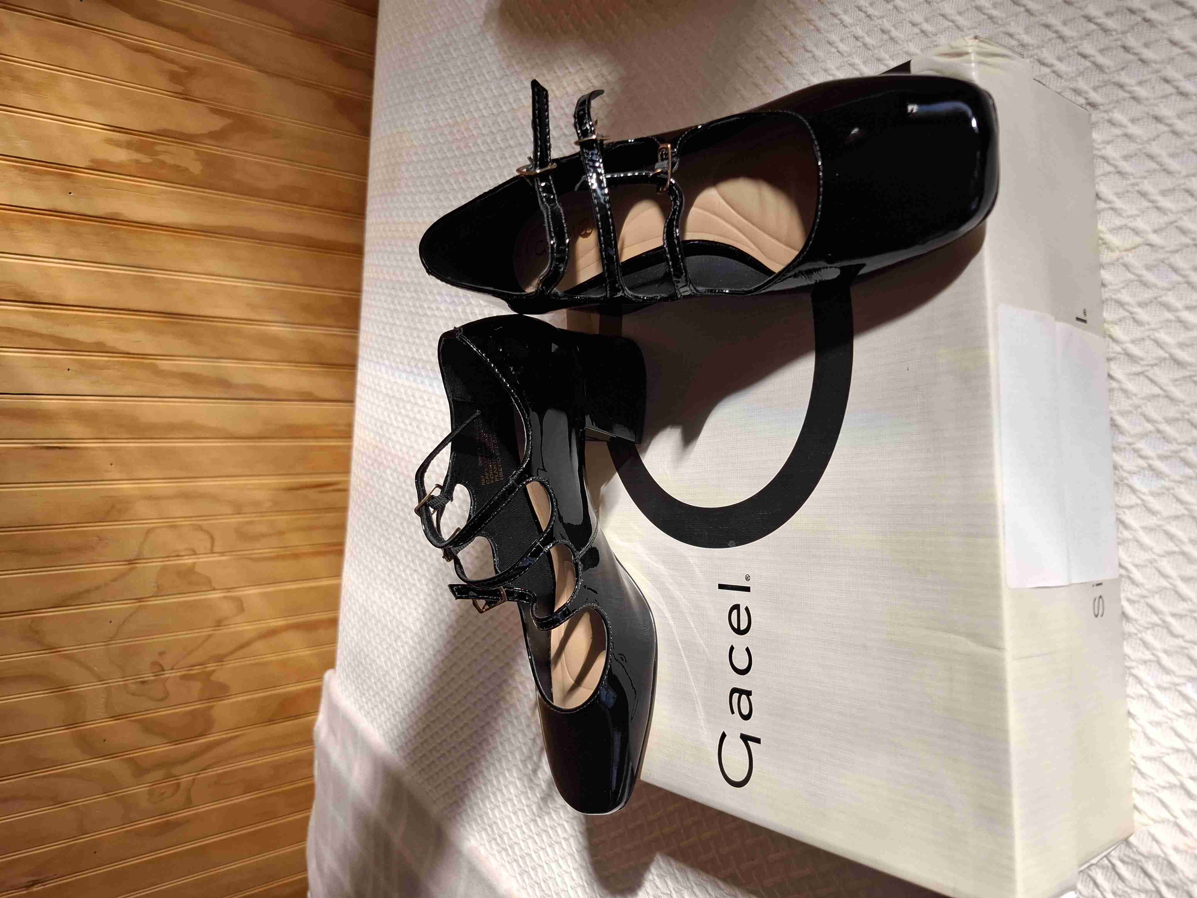 Elegantes zapatos de charol negro con diseño de correas, ideales para ocasiones formales. Están en excelente estado.