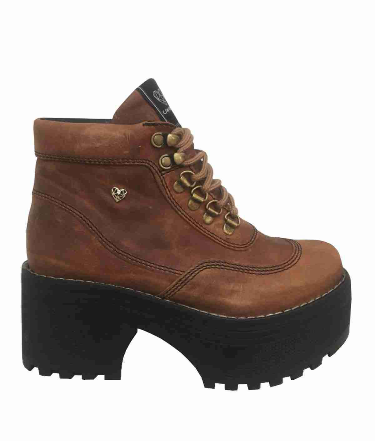Botín de cuero marrón con plataforma gruesa, ideal para un look casual y robusto. Buen estado general.