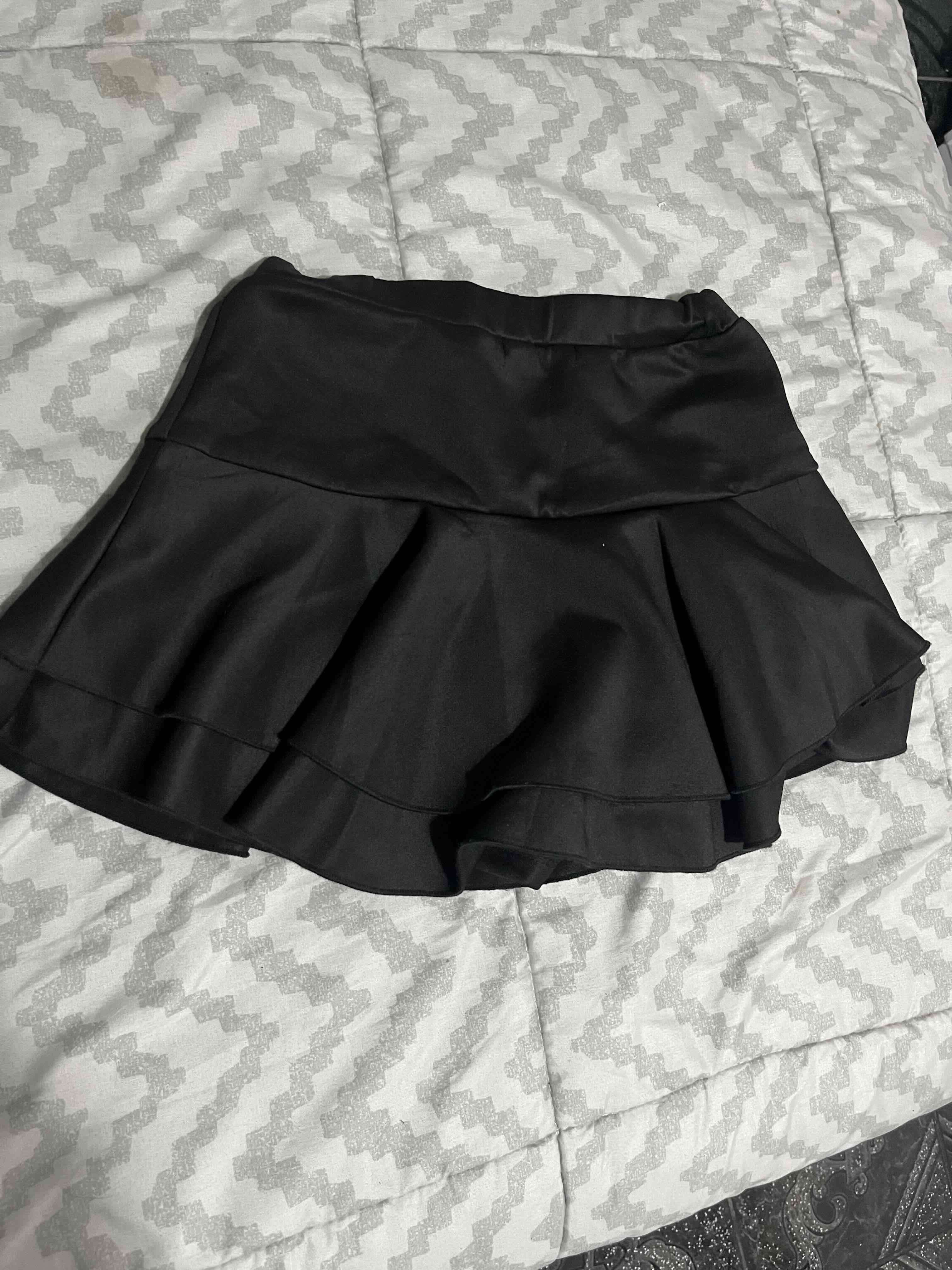 Falda negra short con diseño acampanado, ideal para salidas casuales o formales. En buen estado, sin detalles visibles.