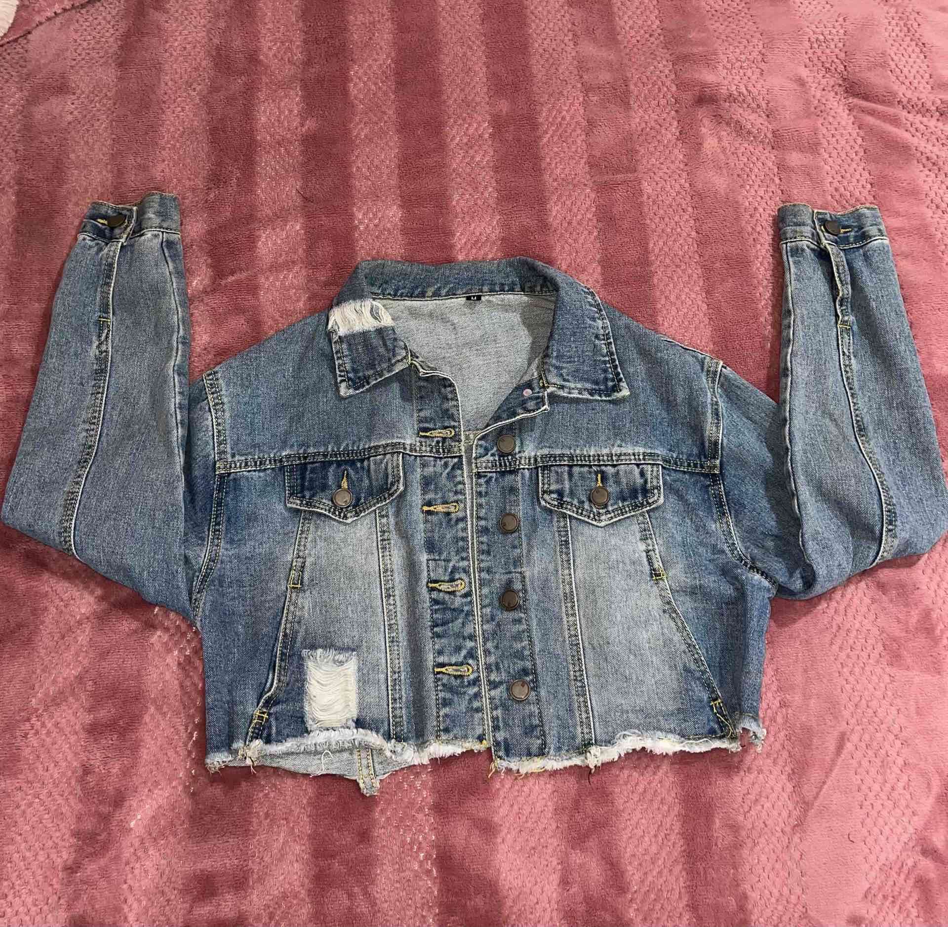 Chaqueta de mezclilla corta con diseño desgastado, ideal para un look casual. Se encuentra en buen estado con signos leves de uso.