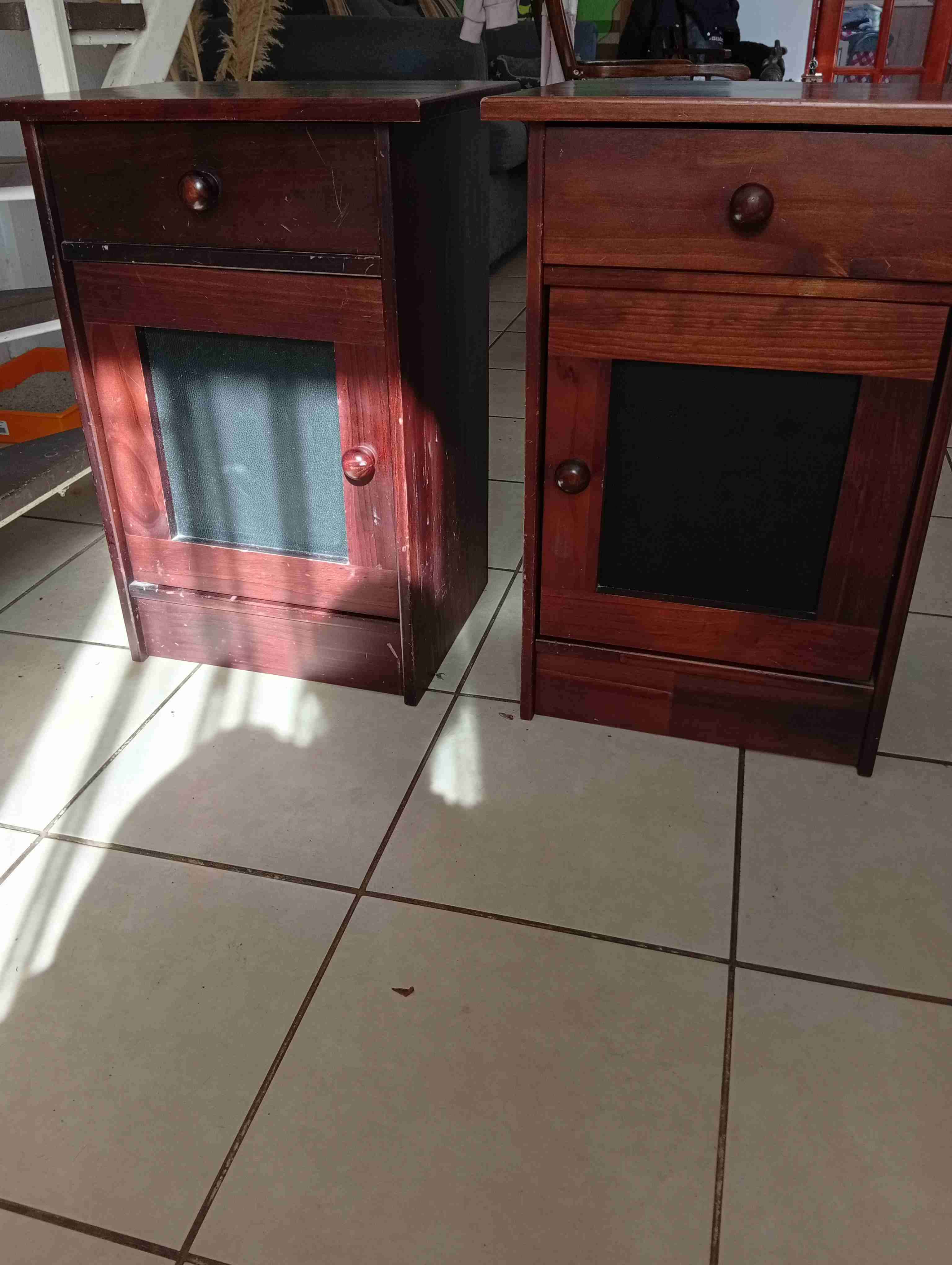 Juego de veladores de madera, en buen estado con detalles menores. Ideal para dormitorios clásicos.