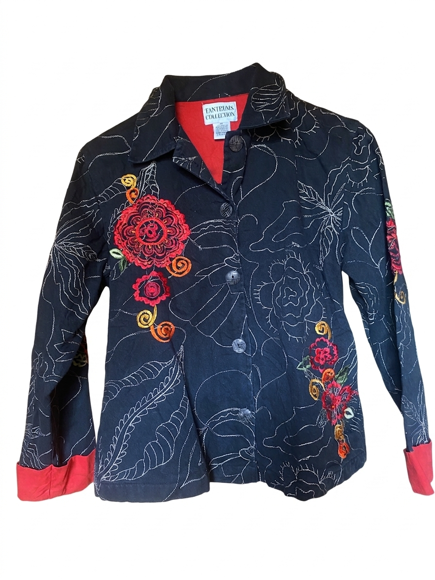 Chaqueta negra con bordados coloridos, ideal para ocasiones especiales. En buen estado y con diseño único.