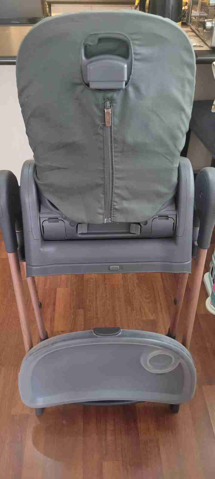 Silla alta para bebé en color gris, ideal para la hora de la comida. En buen estado, con ligera marca de uso, adecuada para niños pequeños. Marca Maxi cosi, ajustable de altura, y de espaldar