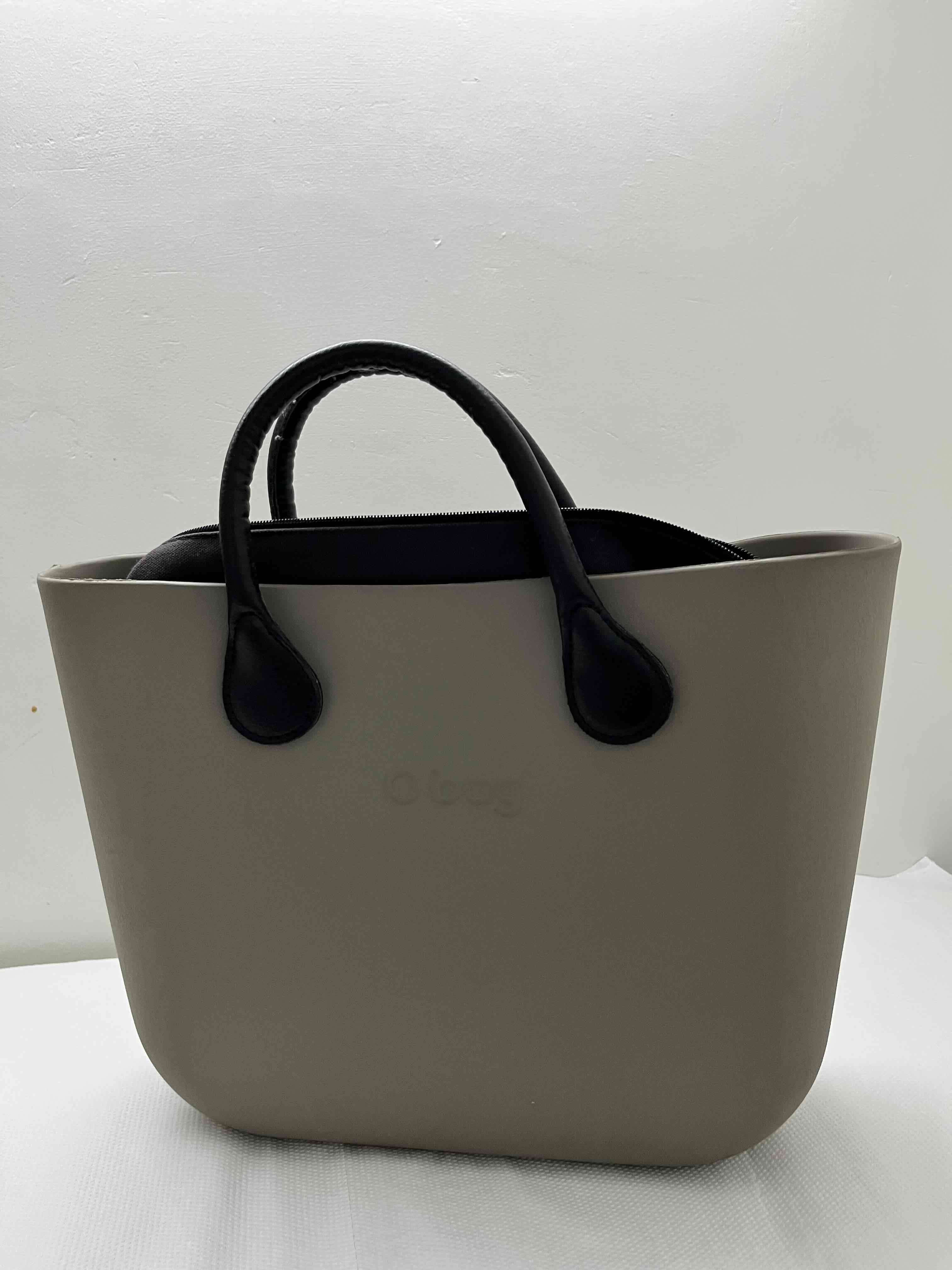 Bolso tote de goma beige con asas negras. Ideal para uso diario. En buen estado.