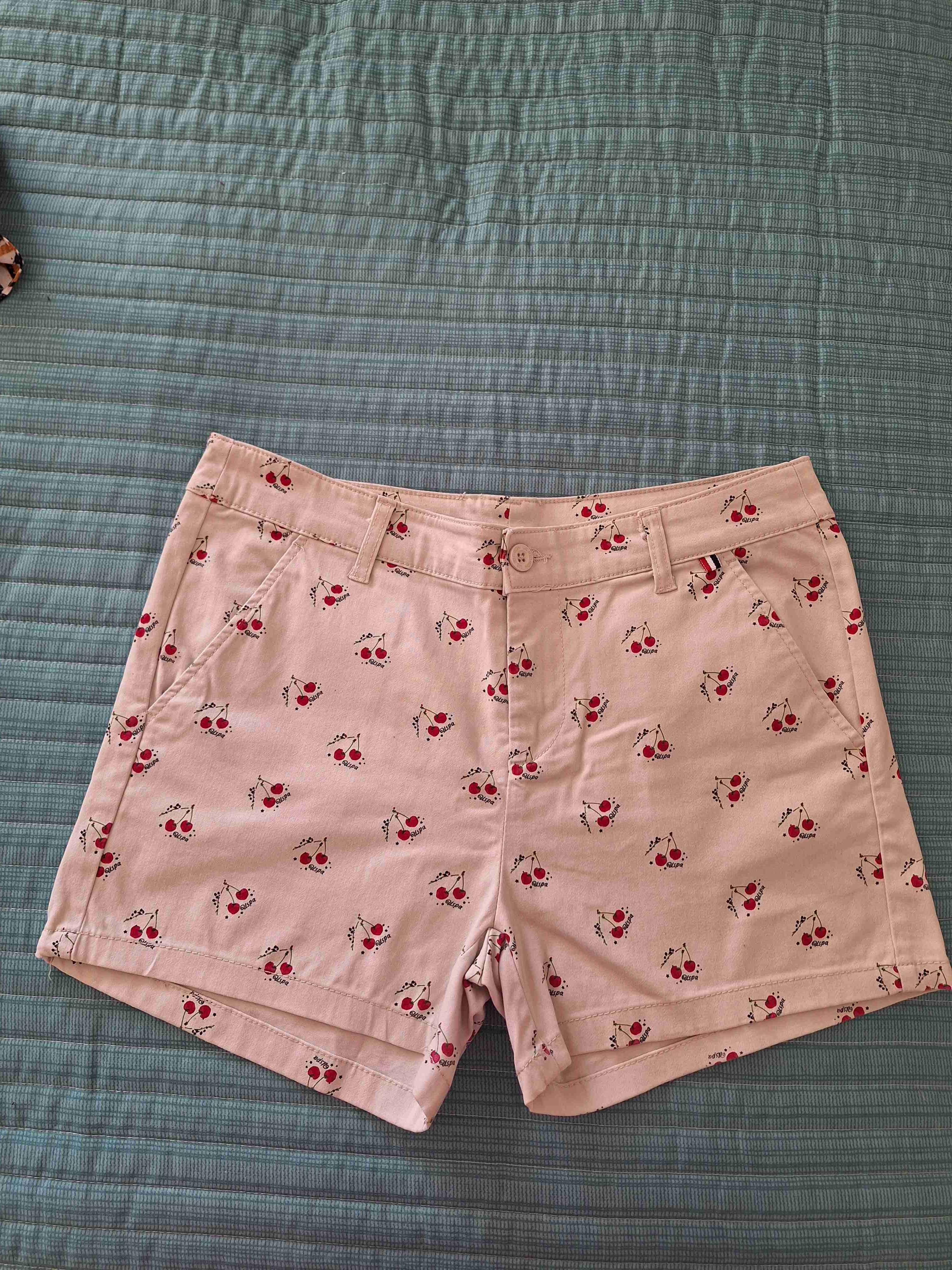 Shorts color beige con estampado de cerezas rojas. Perfectos para el verano, en buen estado general.