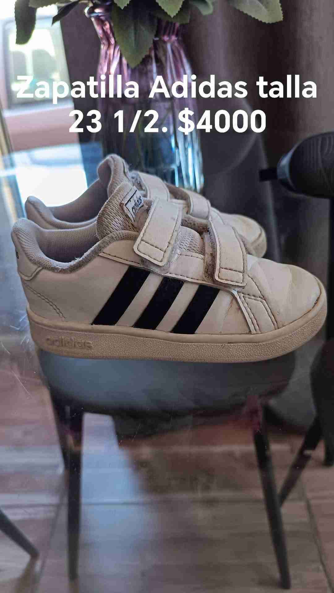 Zapatillas blancas con detalles negros, cierre de velcro. Buen estado, ideales para uso diario.