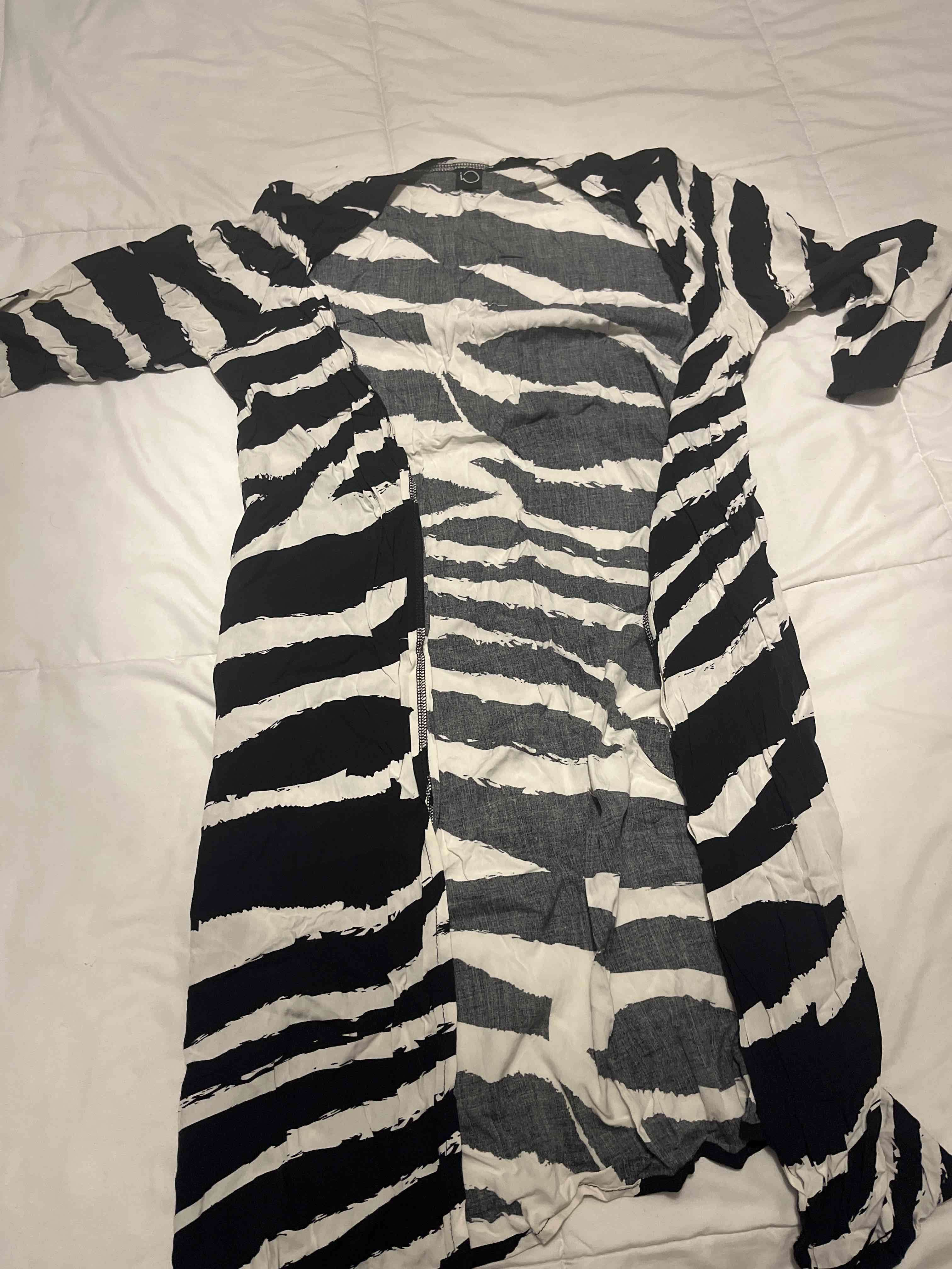 Tapado con estampado de rayas blancas y negras estilo cebra. En buen estado, ideal para uso informal o casual.