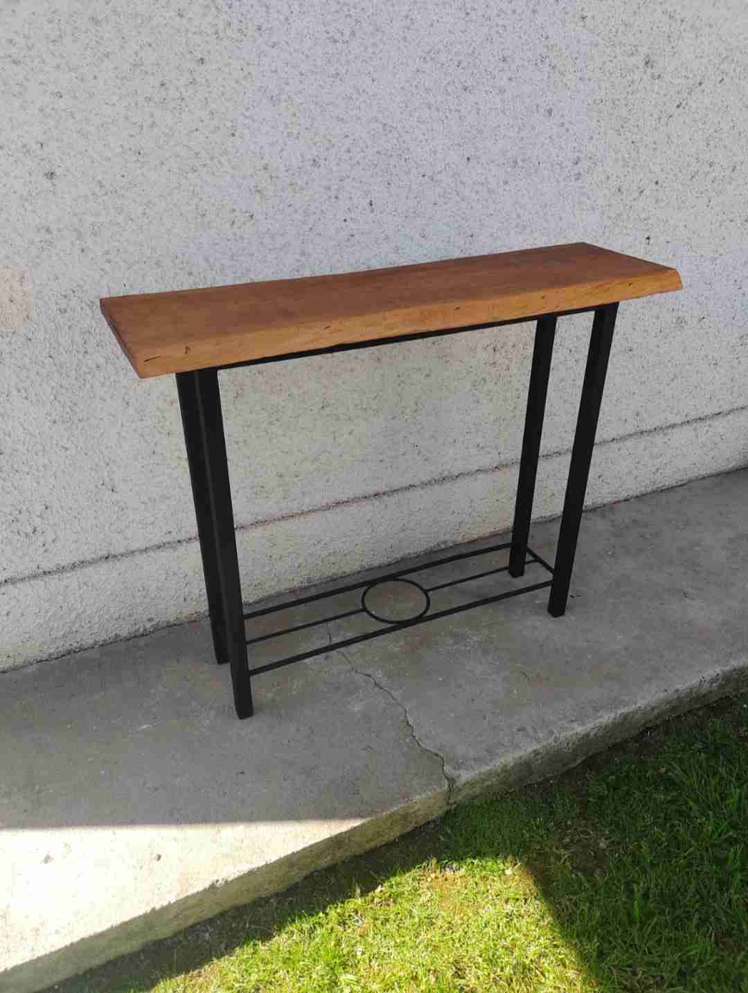 Mesa consola ideal para recibidores o pasillos. En buen estado, con base de metal negro y cubierta de madera. Perfecta para decorar. Hecho a mano. Madera nativa.