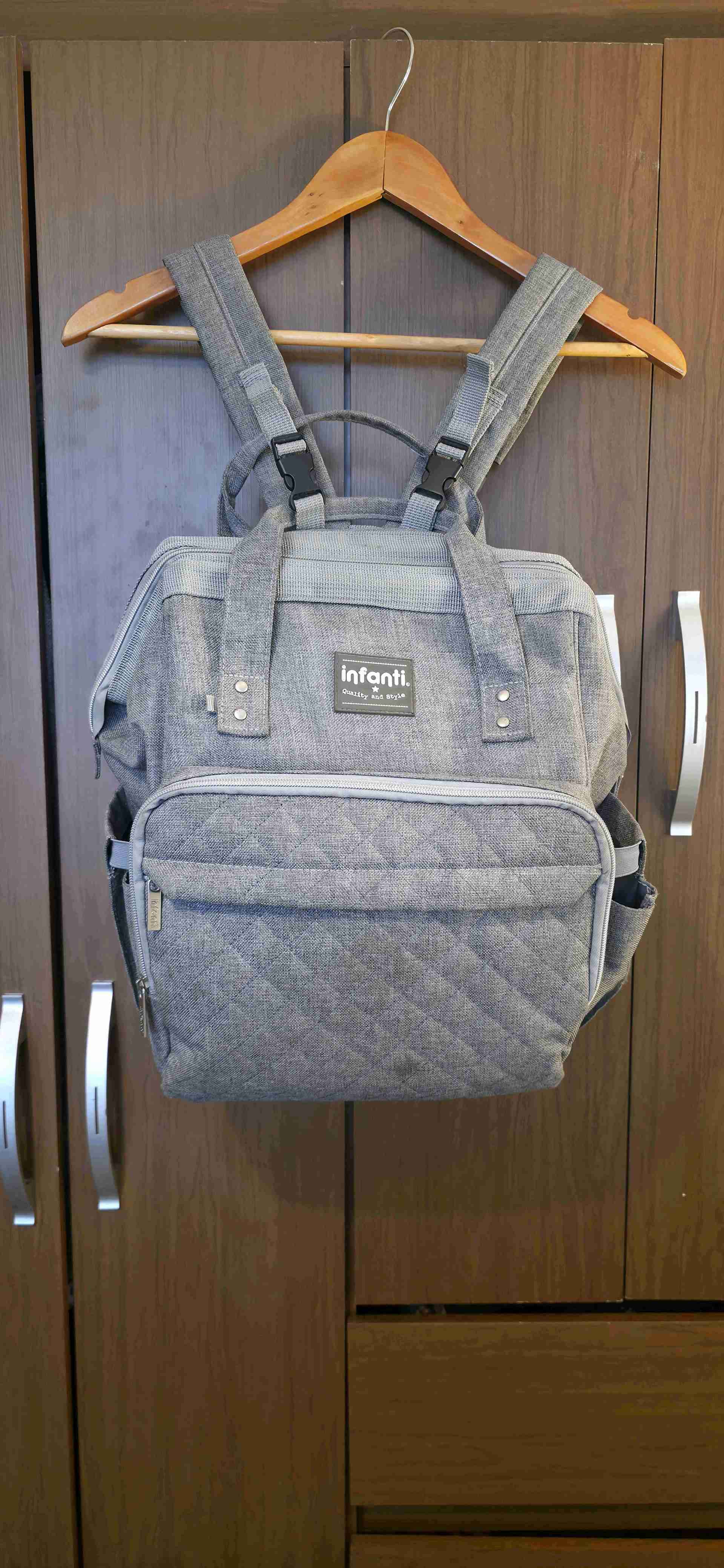 Mochila pañalera gris marca Infanti, cómoda y práctica para llevar todo lo necesario. En buen estado, ideal para salidas con bebé.