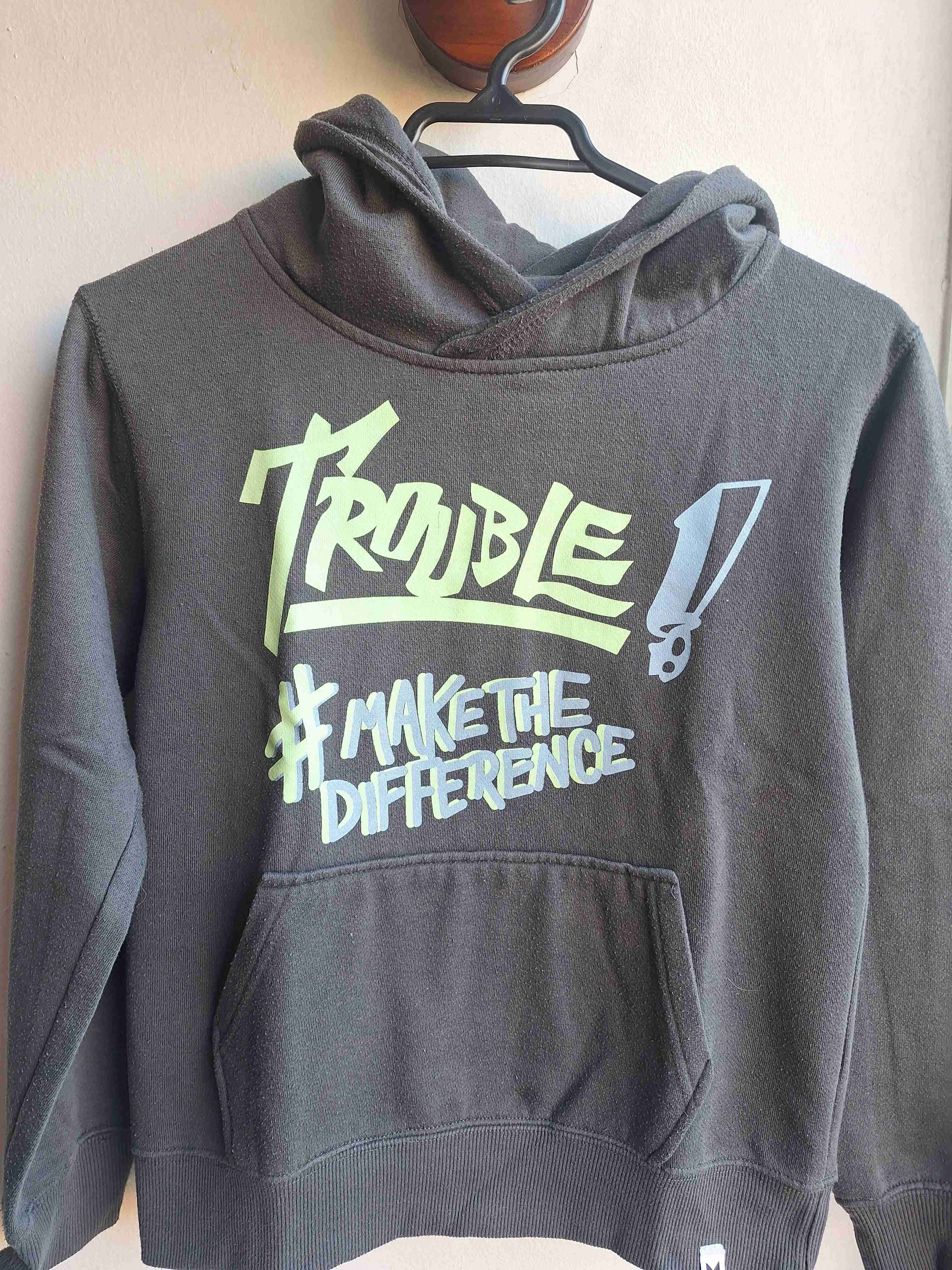 Polerón gris con diseño frontal y capucha. Ideal para un look casual y cómodo. Se encuentra en buen estado.