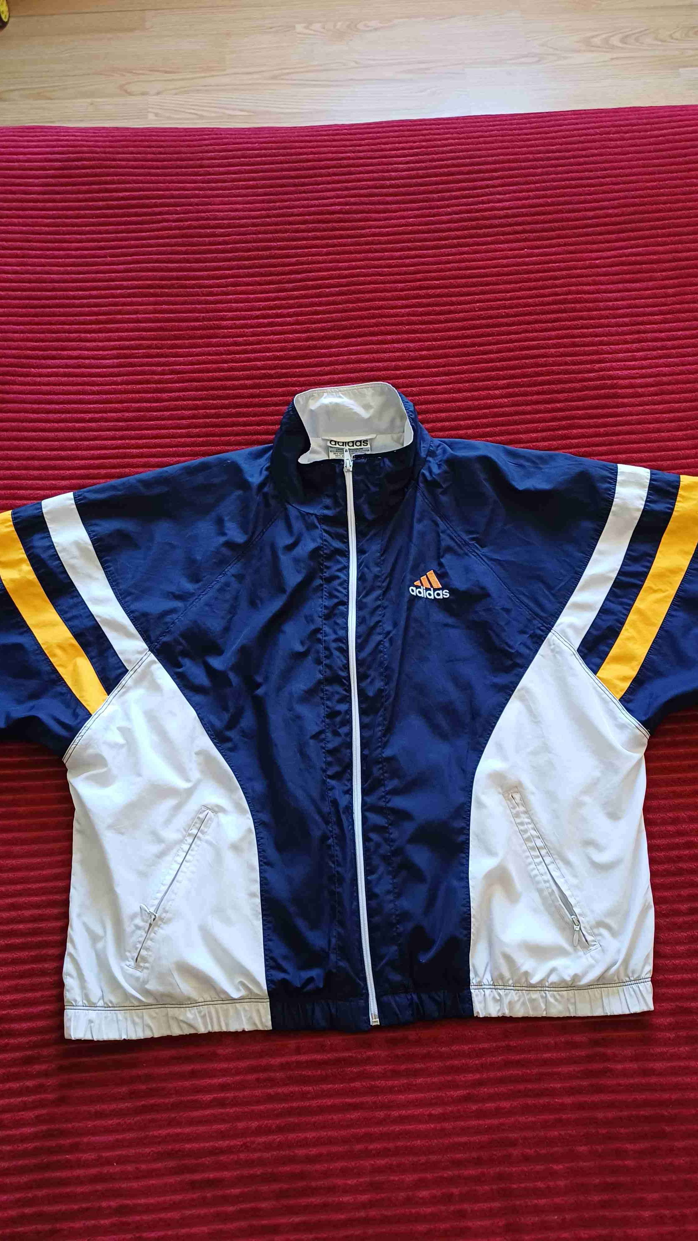 Chaqueta deportiva Adidas de estilo retro en color azul con detalles amarillos y blancos. Buen estado, ideal para actividad física o vestir casual.
