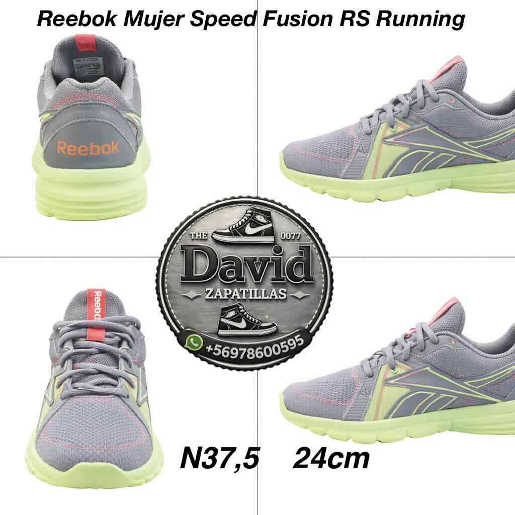 Zapatillas de running Reebok para mujer, color gris con detalles en verde. En buen estado y cómodas para el deporte.