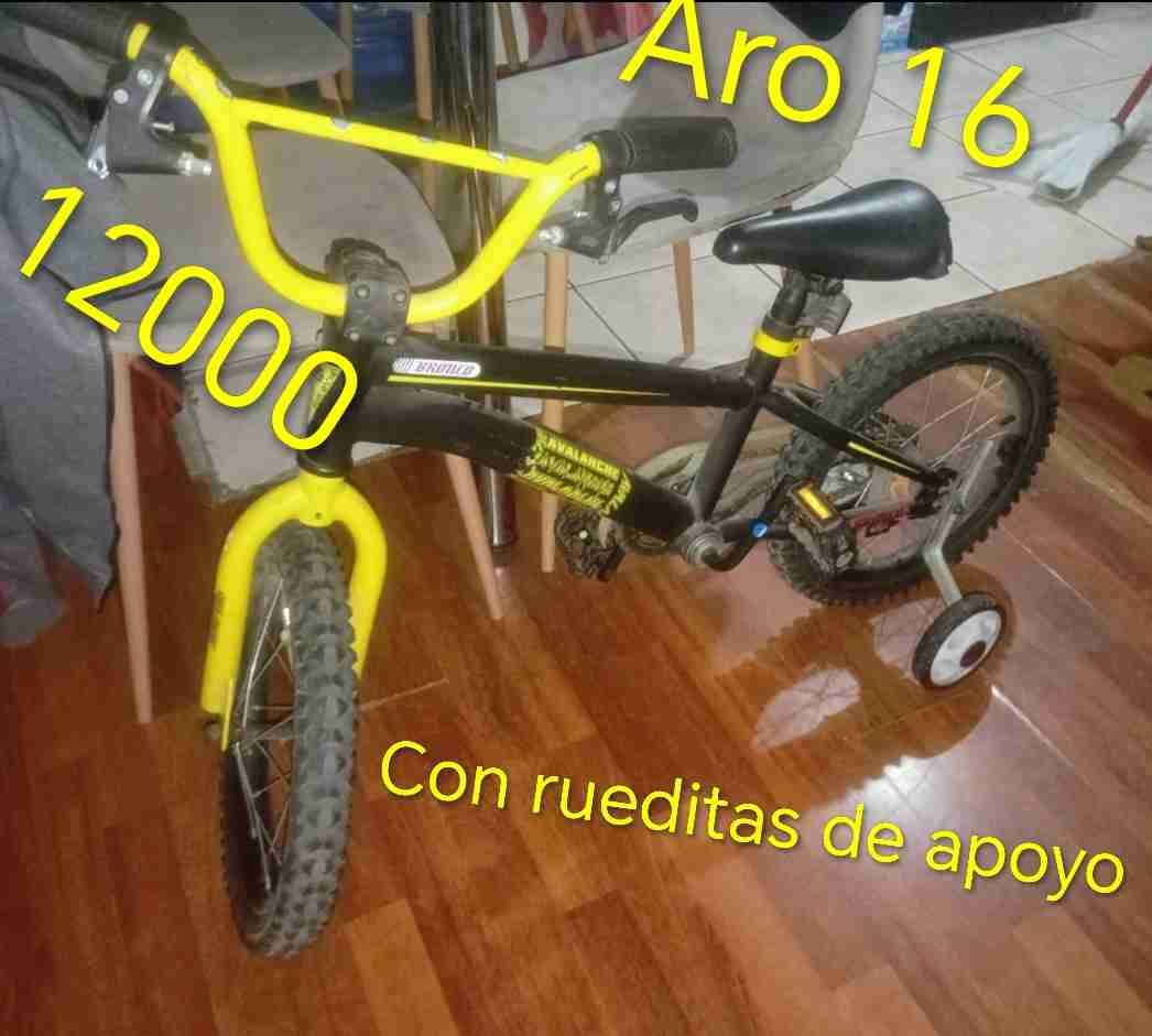 Bicicleta infantil negra y amarilla con rueditas de apoyo. Ideal para aprender a andar con seguridad.Edad aproximadamente de 4 a 7 años, se entrega en estación moneda